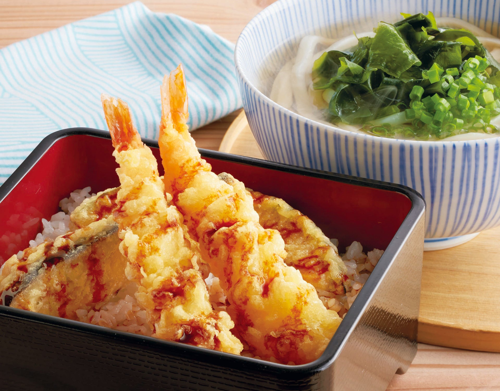 オリジナルの天丼と、味わい深いこだわりの「出汁」を使用したうどんのセットです。