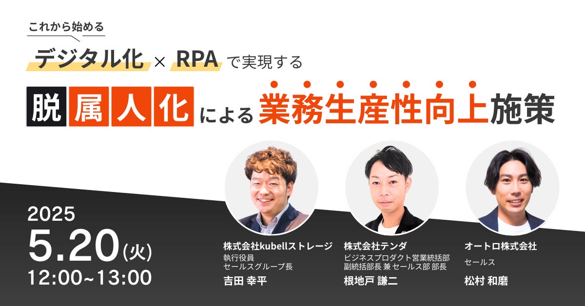 マニュアルトータルソリューションを軸に「ホワイトカラーの業務効率化」を推進する株式会社テンダ(本社/東京都渋谷区、代表取締役会長/小林 謙、以下「テンダ」)は、株式会社kubellストレージ(本社/東京都港区、代表取締役社長/中 哲成、以下「kubellストレージ」)およびオートロ株式会社 (本社/東京都港区、代表取締役/福田 志郎、以下「オートロ」)と、2025年5月20日(火)に「これから始める デジタル化 × RPAで実現する脱属人化による業務生産性向上施策」と題し、共催ウェビナーを開催いたします。