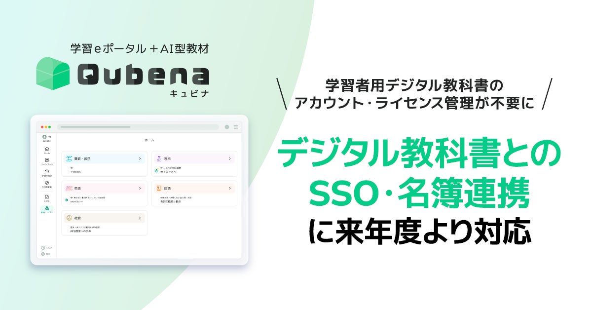 そうした取り組みの一環として、このたび、キュビナの学習eポータルと、富士ソフト株式会社が提供するデジタル教科書配信プラットフォーム「みらいスクールプラットフォーム」とのLTI連携により、開隆堂出版株式会社、学校図書株式会社、教育出版株式会社、日本文教出版株式会社の学習者用デジタル教科書とのSSO認証および名簿連携に対応いたしました。SSO認証によりキュビナと学習者用デジタル教科書の学びがシームレスにつながるとともに、名簿連携により年度更新などのアカウント・ライセンス管理にかかる負担が軽減され、学校現場の働き方改革にも寄与いたします。本連携の提供開始は2026年4月を予定しております。