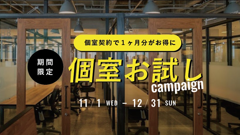 2023年11月1日(水)~12月31日(日)の期間中に個室会員の申込をした方を対象に、フリーレント1ヵ月がついてくる「個室お試しキャンペーン」を開催します。