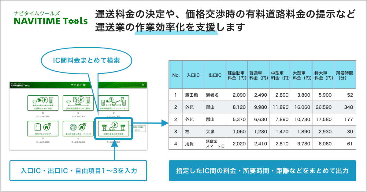 業務支援Webサービス『NAVITIME Tools』、「IC間料金まとめて検索」機能を提供開始