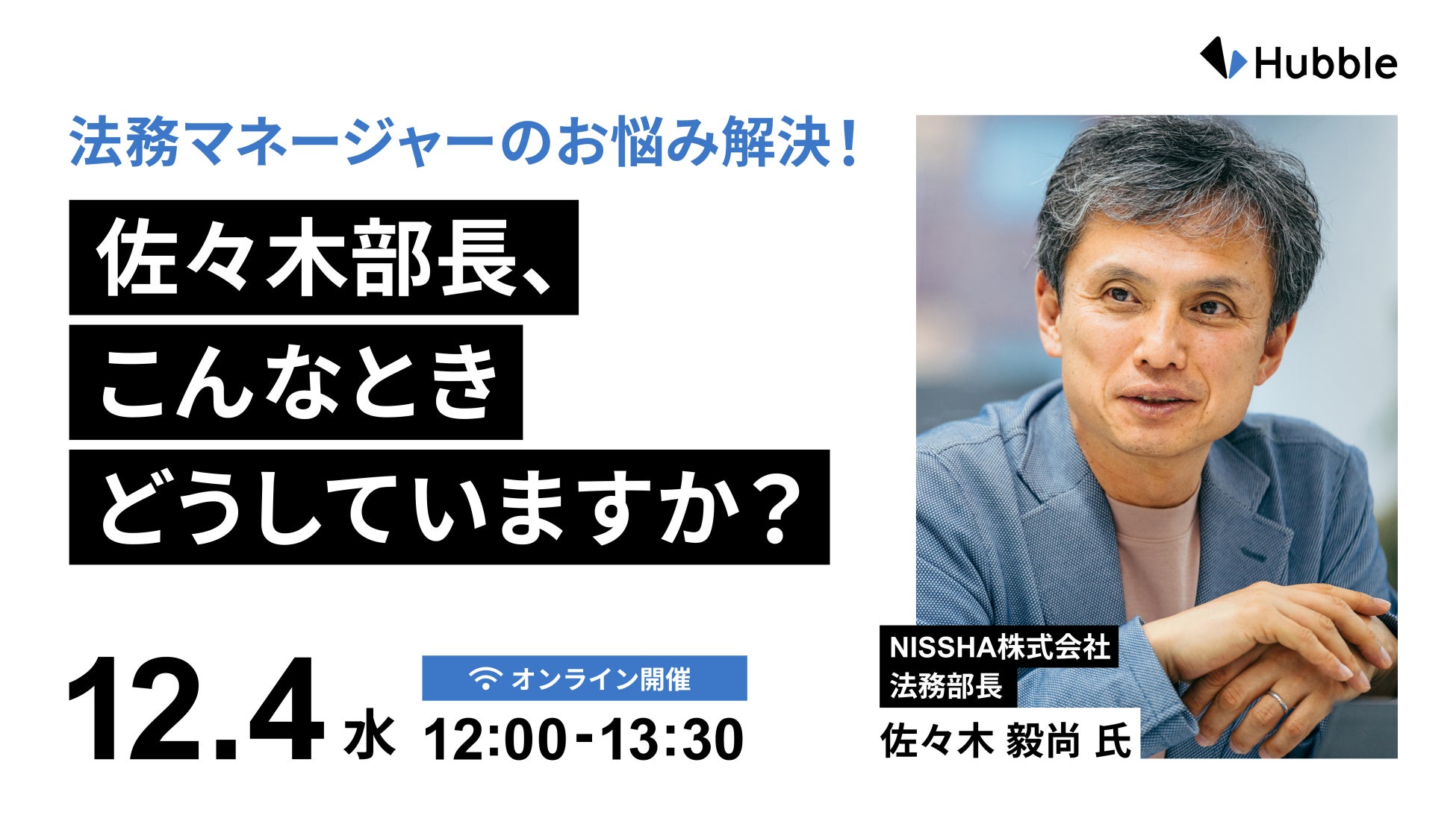 法務と事業部門の協業性を高める契約業務・管理クラウドサービス「Hubble(ハブル)」を提供する株式会社Hubble(東京都渋谷区、CEO:早川晋平)は、12月4日(水)12:00〜13:30にて、NISSHA株式会社 法務部長 佐々木 毅尚 氏をお招きし、「法務マネージャーのお悩み解決!佐々木部長、こんなときどうしていますか?」と題したウェビナーを開催いたします。本ウェビナーはZoomでのオンライン配信・事前登録制です。