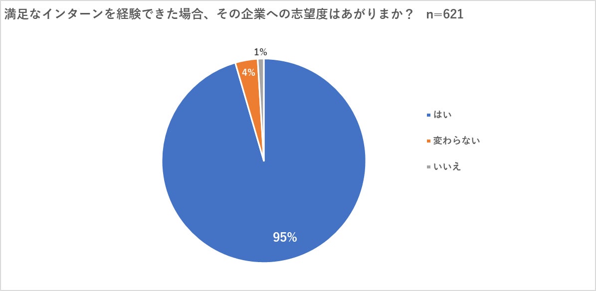 「満足なインターンを経験できた場合、その企業への志望度はあがりますか?」の質問では「はい」が95%を占め、インターンの満足度が「企業イメージの向上」につながる結果となりました。