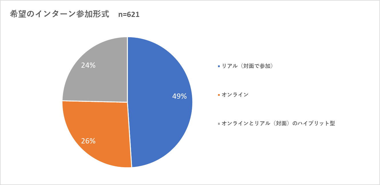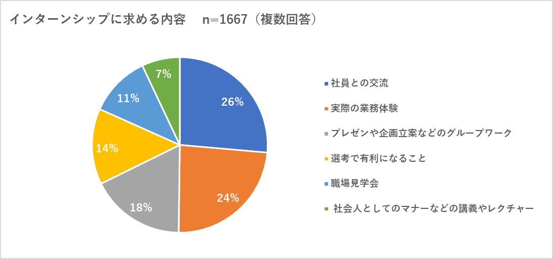 また、「社会人としてのマナーなど講義やレクチャー」を希望する声(7%)もあり、社会に出る前の「社会人としてのふるまい」の勉強の場としてのインターンを考えている学生もいました。