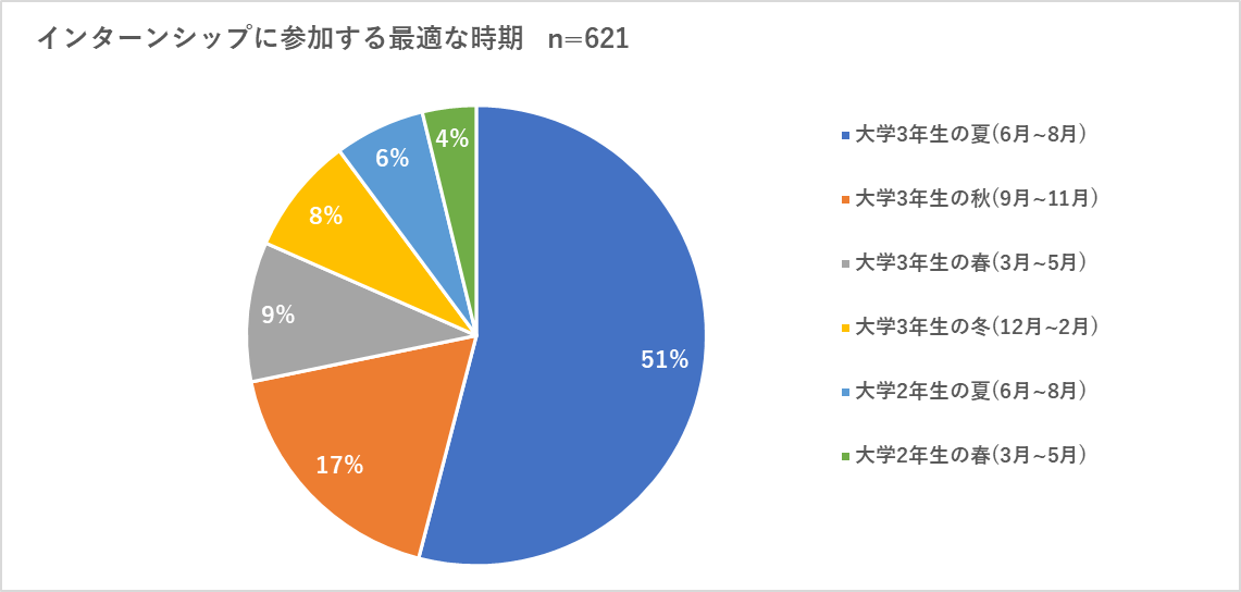 時期は「6~8月」が51%と最も多く、次いで「9~11月」の17%ですが、回数をこなし、複数のインターンを経験したい学生にとっては「受け入れ期間」の設定も満足度向上の要素となります。