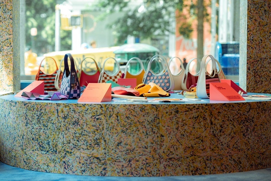コーチ ソーホーストアのためにデザインされたプレイフルでライブ感のあるポップアップ ストアには、アップクラッシュドレザーを使用した什器や、製造工程で出たスクラップレザーを生まれ変わらせたカスタムパッチワークのソファー、アップサイクル素材で作られたサイネージなど、ブランド全体で推進しているサーキュラーデザインの哲学を捉えたインテリア要素があふれています。さらに、アーティストであり、今回のプロジェクトのコラボレーターでもあるスキルセット (Skilset) とニコール・マクラフリン (Nicole McLaughlin) による一点ものの作品も展示されています。