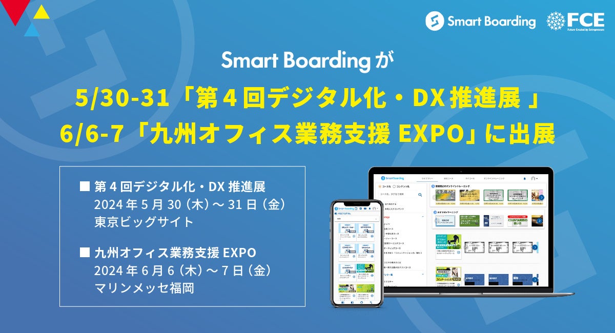 株式会社FCE(本社:東京都新宿区、代表取締役:石川淳悦、東証9564)が提供する、社員教育プラットフォーム「Smart Boarding」(スマートボーディング)(https://www.smartboarding.net/)は、2024年5月30(木)~31日(金)東京ビッグサイトにて開催されます「第4回デジタル化・DX推進展」、2024年6月6(木)~7日(金)マリンメッセ福岡にて開催されます「九州オフィス業務支援EXPO 」出展いたします。