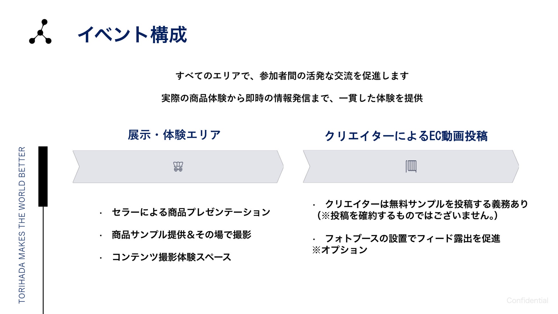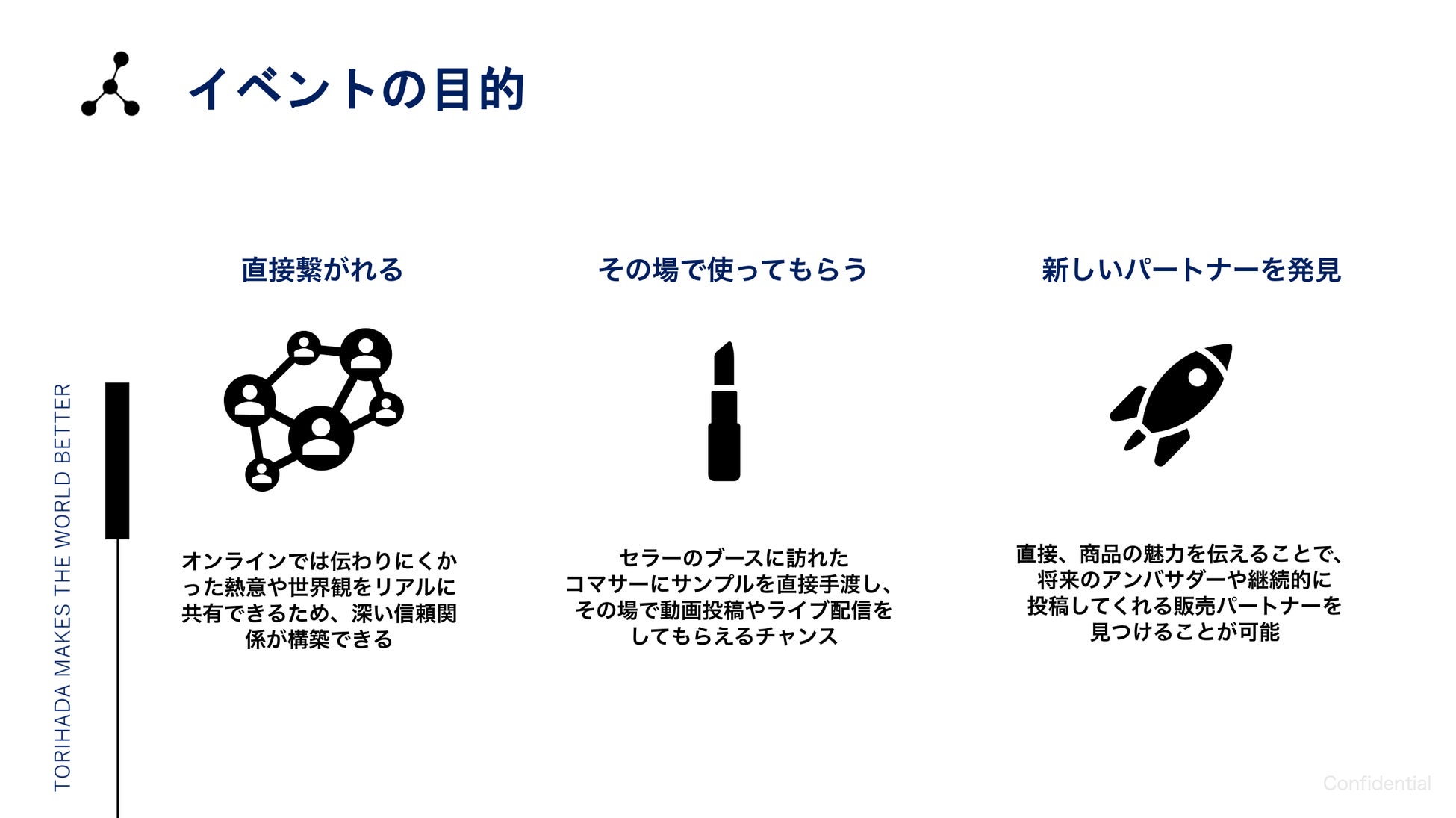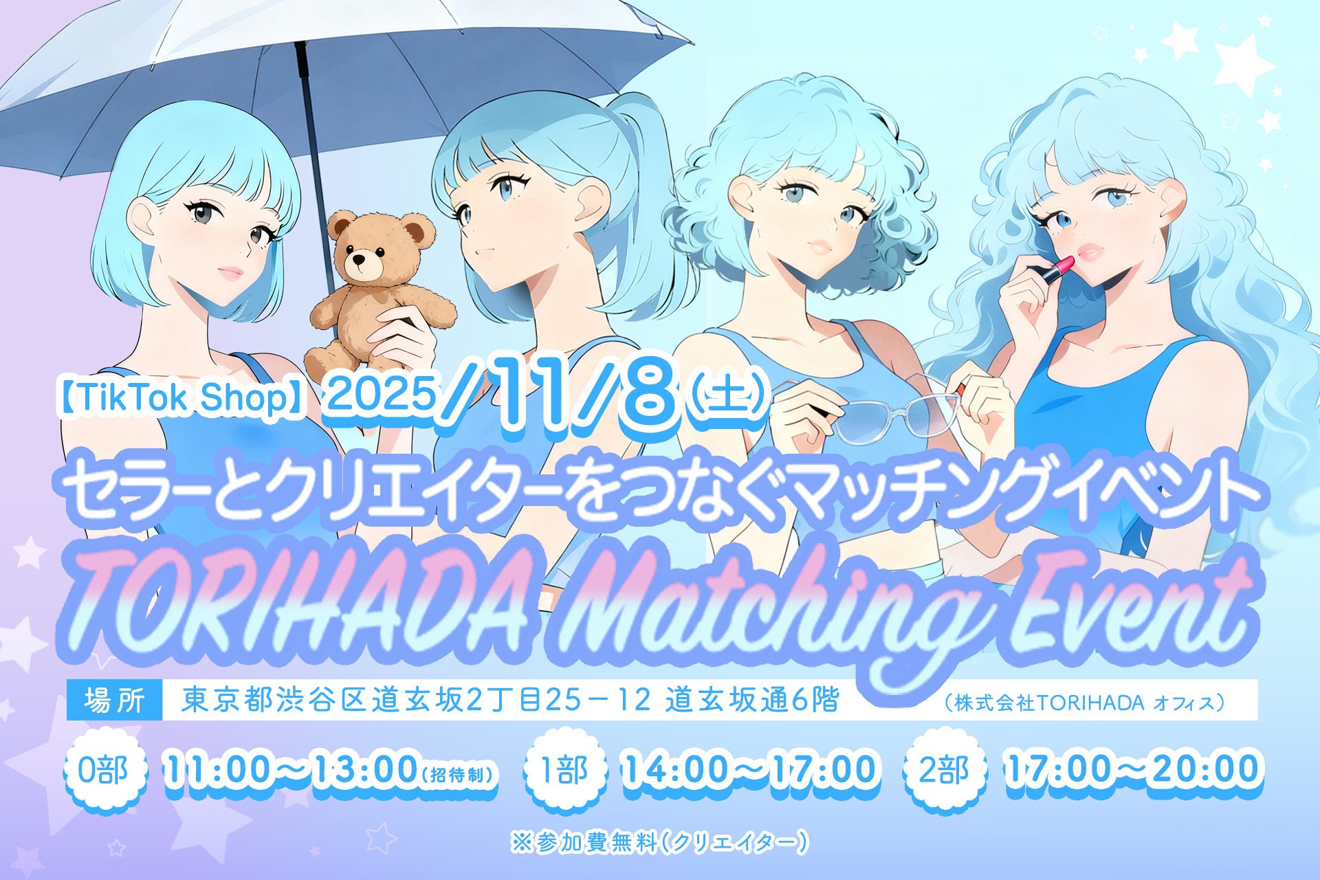 TORIHADAは、TikTok Shopの認定パートナーである「TSP(TiKTok Shop Partner)」「TAP(TikTok Shop Affiliate Partner)」「CAP(Creator Agency Partner)」の全ての分野において認定を取得しています。TikTok Shopの日本でのリリース直後、2025年7月末にはセラー(販売者)とクリエイターを繋ぐマッチングイベント第一回目を開催しました。前回の成果を踏まえ、今回はクリエイター200名、セラー20社(いずれも予定)へ規模を拡大。会場では、企業ブースでのプレゼン/試用、個別商談、そしてその場での即時撮影を通じて、クリエイターとセラーのダイレクトな連携を後押しします。