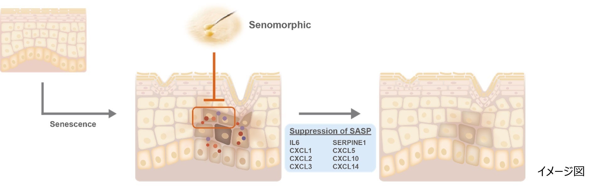 老化の原因の一つとして、近年、「細胞老化」という現象に関心が集まっています。通常、細胞は古くなると体から取り除かれ、新しい細胞に置き換わることで健康な組織を維持しています。しかし、加齢とともに老化した細胞が増えると、組織の老化を引き起こすことが知られています。その理由の一つに、老化した細胞が炎症を引き起こす特異な変化(SASP)を生じ、この時に放出される炎症性物質(SASP因子)が周辺の細胞を老化させることで、組織全体の老化を引き起こすことが挙げられます。そのため、SASP因子の分泌抑制は世界中の研究機関から注目されるターゲットであり、老化細胞の機能を阻害する薬剤(セノモルフィック薬)の抗老化作用に期待が寄せられています。