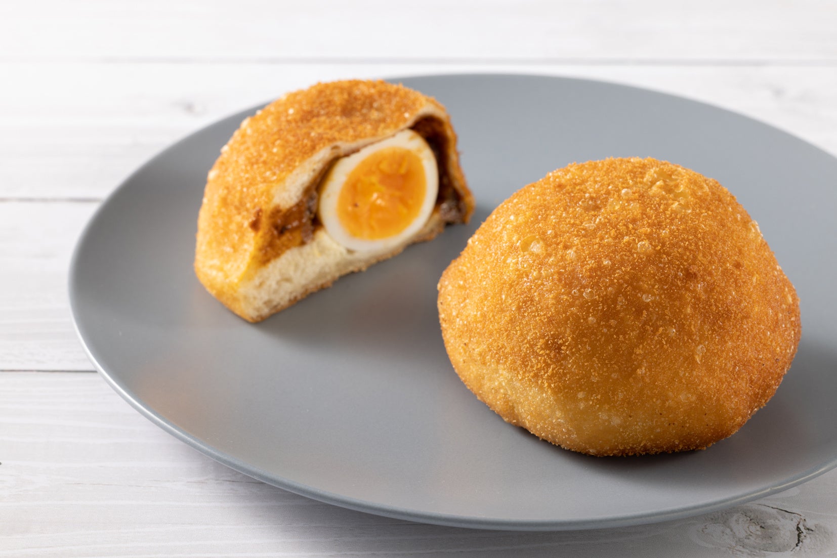 毎年ご好評をいただいているゆで卵1つを大胆に入れたカレーパンが今年も登場します。しっかりと辛みの効いたカレーと、贅沢に入れた丸々1個のゆで卵の絶妙なバランスがお楽しみいただける、辛党の方にもおすすめのカレーパンです。