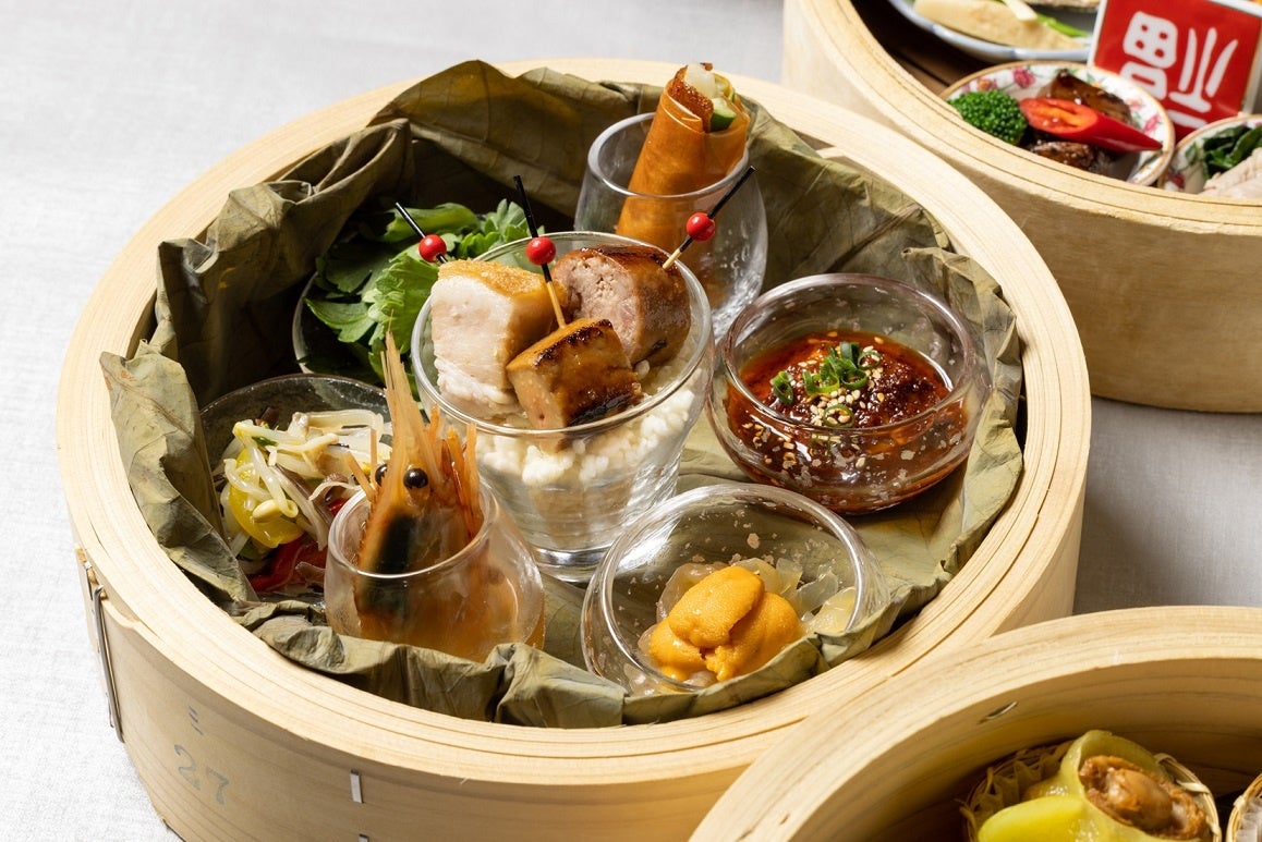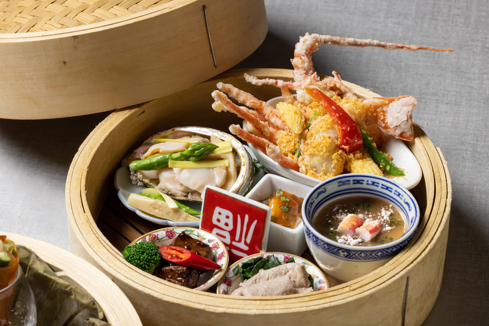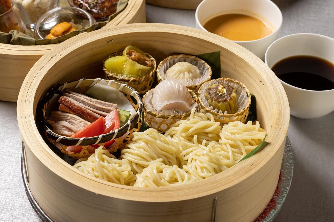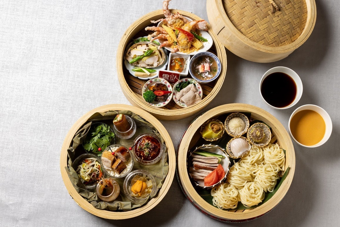 ホテル開業20周年を記念し、毎年夏にご好評いただいている2段セイロの宝龍冷麺を特別バーションでお届けいたします。直径が約30cm の大きなせいろを3段つかってご用意する今年の宝龍冷麺は、鮑やソフトシェルロブスター、穴子など夏に旬を迎える高級食材をつかい、北京・上海・四川・広東の中国四大料理が一度にお楽しみいただける盛りだくさんの内容です。前菜、点心、スープ、メインまで、約20種の料理を詰め込んだ、ボリューム満点ながらさっぱりとお召し上がりいただけるメニューです。チャーシューのつけダレで焼いたフォアグラや紹興酒が香るボタン海老、野菜の皮で作った北京ダックなどの7種類の前菜をはじめ、24時間体制で飼育された殻ごと食べられる脱皮したてのソフトシェルロブスターのフライや、まろやかなオイスターソースで焼き、ブラックペッパーでアクセントを加えた十勝ハーブ牛サーロイン、真珠の粉をかけてお召し上がりいただく上海蟹の味噌を溶かし込んだコラーゲンスープなどの6種類のメインが揃います。さらに、最下段には人気の点心と麺をご用意。自家製の醤油ダレとゴマダレの2種類で味を変えながら、飽きることなくお楽しみいただけます。さまざまな中国料理を少しずつ一度に楽しめるこの夏限定のラグジュアリー宝龍冷麺をぜひお試しください。