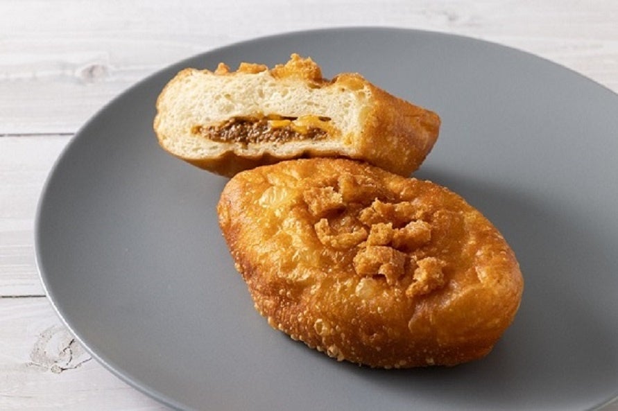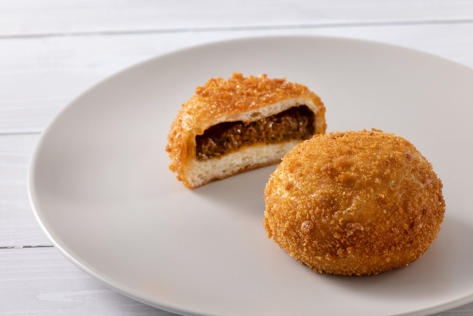 牛乳で仕込んだドーナツ生地に中辛カレーとコクのあるチェダーチーズを入れて揚げるカレーパン。もちもちでほんのり甘いパン生地がカレーとチーズのコクを引き立てます。バゲットをちぎってつくった大きめのパン粉をトッピングすることにより、カリカリとした食感のアクセントもお楽しみいただけます。