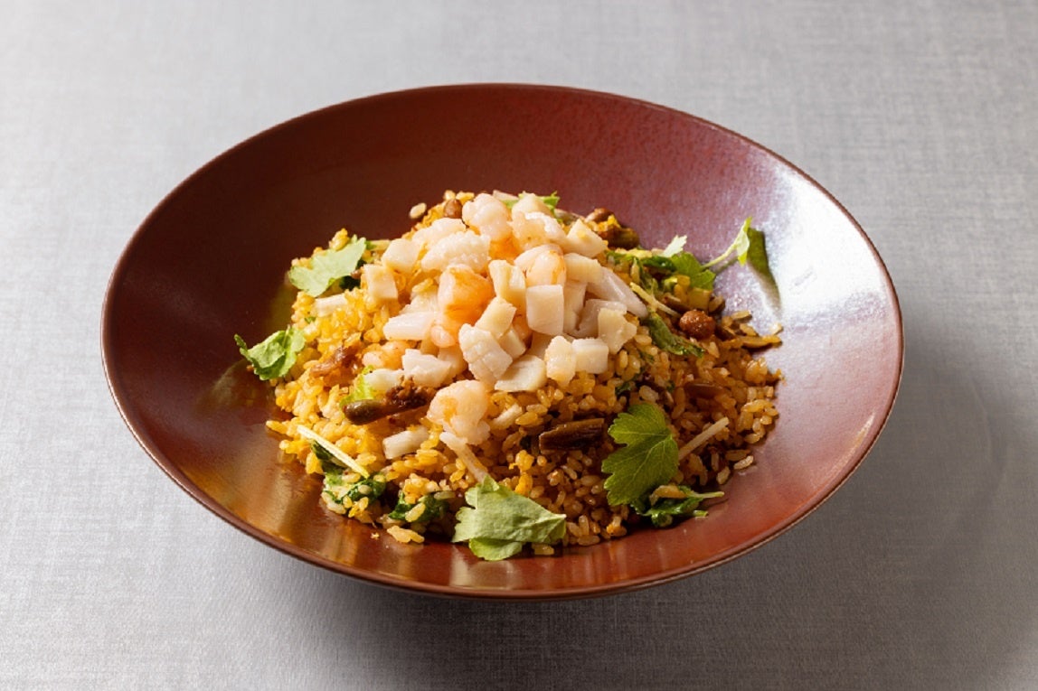 無農薬のあきたこまちを四川式のピリッとした辛さが特徴のからし菜、山くらげ、唐辛子の漬物を一緒に大胆に炒め、パラパラに仕上げた炒飯です。ご飯の上にはプリプリの食感が食欲を刺激するアオリイカ、エビ、帆立を乗せています。一見辛くなさそうですが、漬物がピリッと辛く、トッピングした新鮮なホワイトセロリは口の中をさっぱりとさせてくれる、最後まで食べ飽きない一品です。