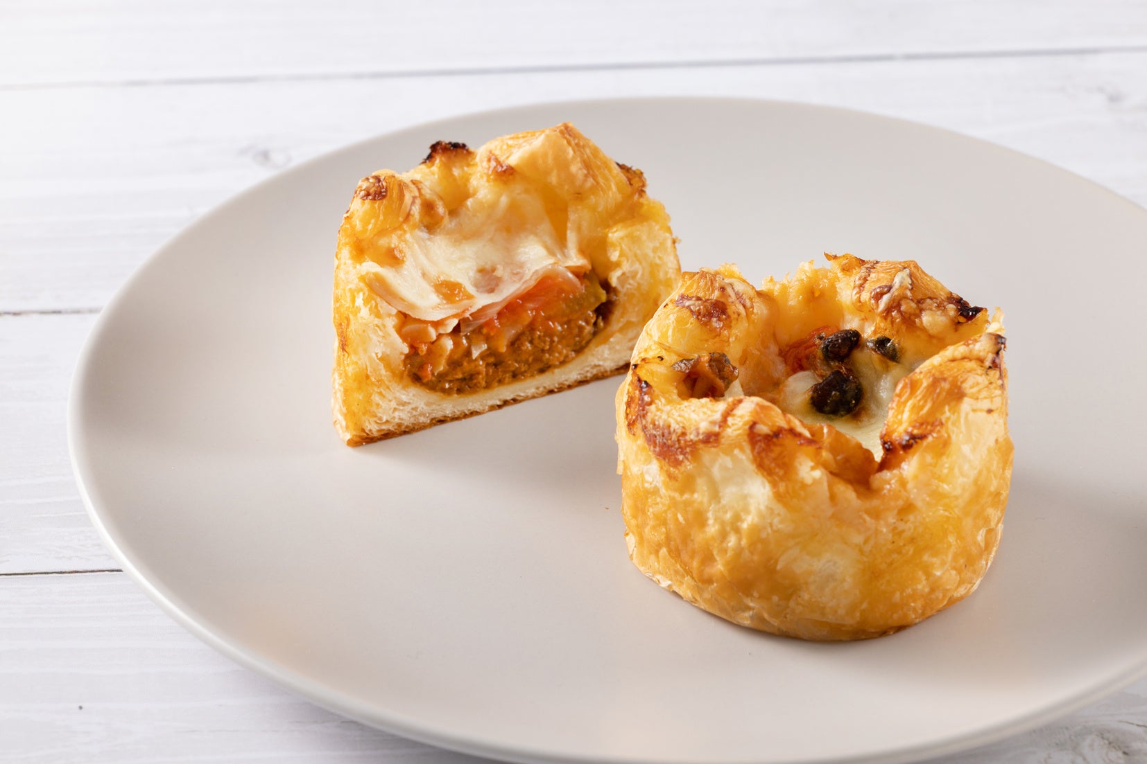 バターが香るほんのり甘いデニッシュ生地に、スパイス香るキーマカレーを絞り、その上に玉ねぎとしめじをトマトペースと和えた具材、そしてマイルドな味わいのグリュイエールチーズを乗せています。揚げずに焼き上げるのが特徴のカレーパンです。