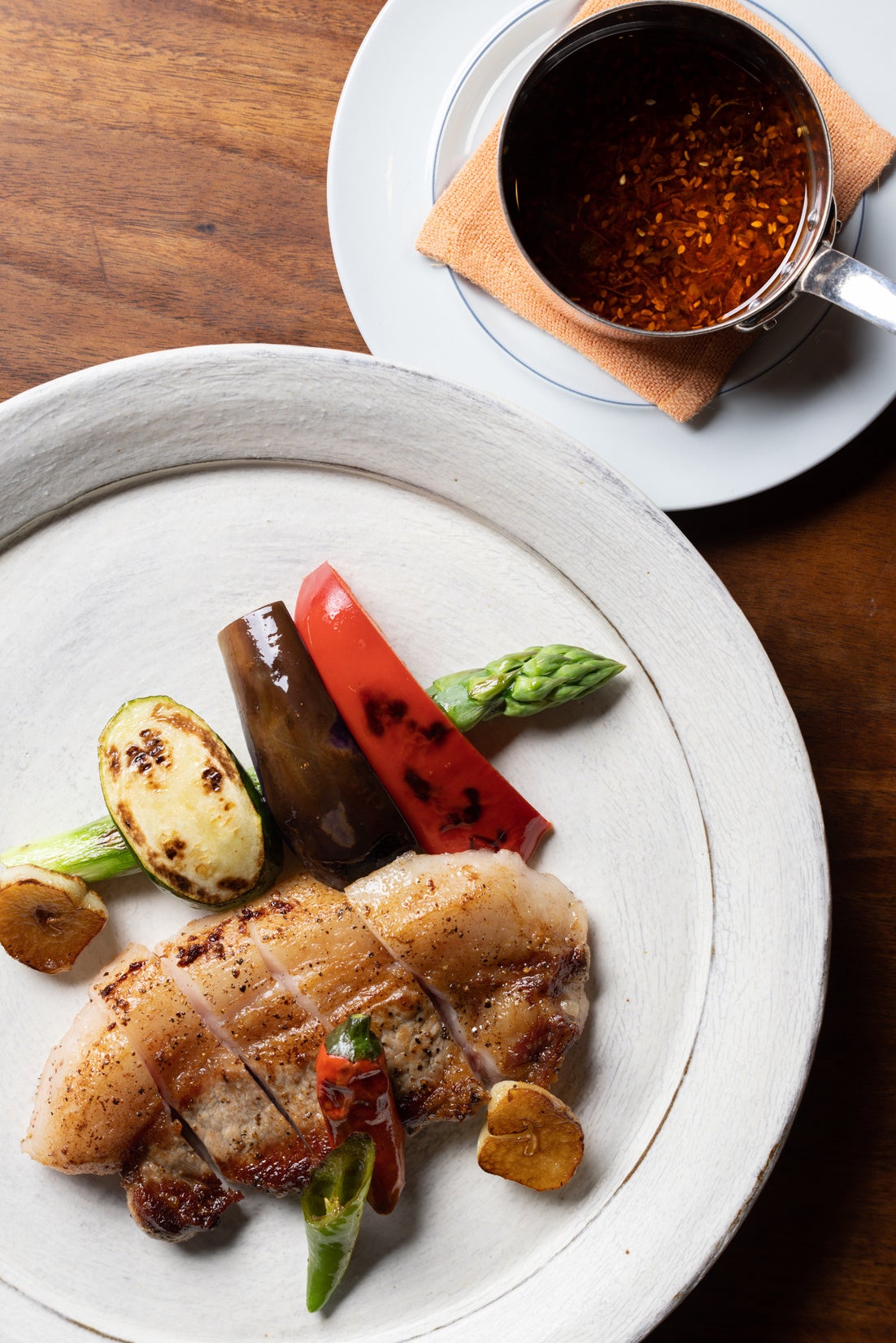 青唐辛子やチリ、ニンニクとともに鉄板で焼き上げる「十勝ロイヤルマンガリッツァ豚」に、細かく刻んだ青唐辛子、フレッシュチリやネギ、まろやかで旨味の強い五島列島の塩などを混ぜ合わせたスパイシーなソースをかけてお召し上がりください。鉄板焼レストランならではの、目の前で調理するライブ感や、ダイレクトに伝わる食材やスパイスの香りもまた食欲をそそる、五感でお楽しみいただけるお料理です。