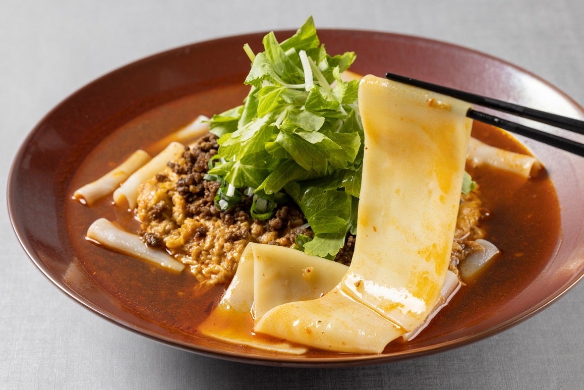 前菜でご好評いただいているチャイナルームの人気メニューのよだれ鶏と、刀削麺が同時に楽しめる一品が登場いたします。鶏は低脂肪、低カロリー、低コレステロールの三拍子揃った宮崎県産の日向鶏のもも肉を使用。もちもちの刀削麺に豆板醤とコチュジャンがベースの冷製スープがよく絡みます。さらに辣油やねり胡麻のソースが効いた柔らかいよだれ鶏、トッピングした歯ごたえのいい紅芯大根も一緒に頬張ってお楽しみください。