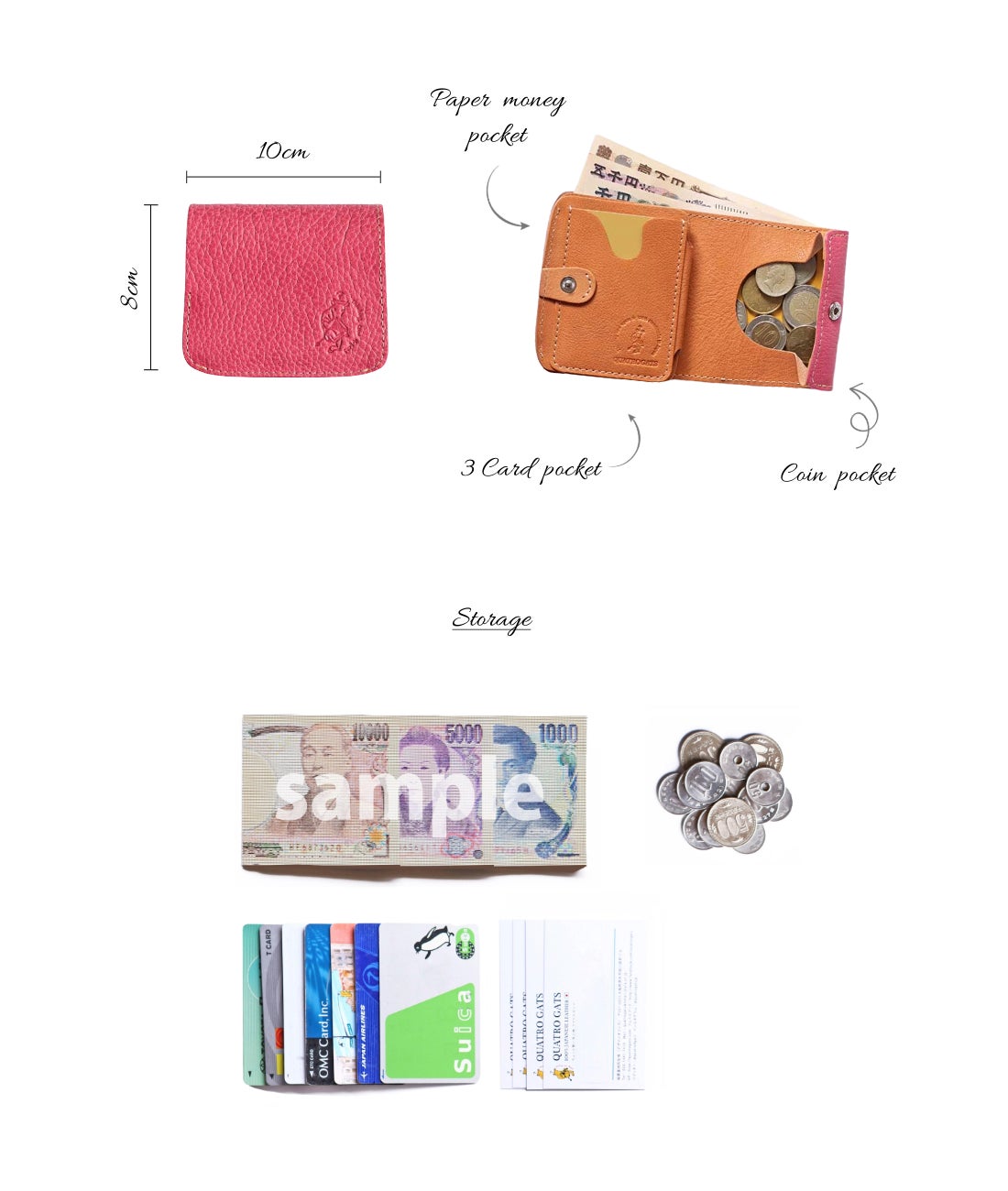 手のひらサイズながらお札は約10~20枚・コインは約20~30枚・カードポケット2箇所:約6~9枚。必要なものは全て入ります。
