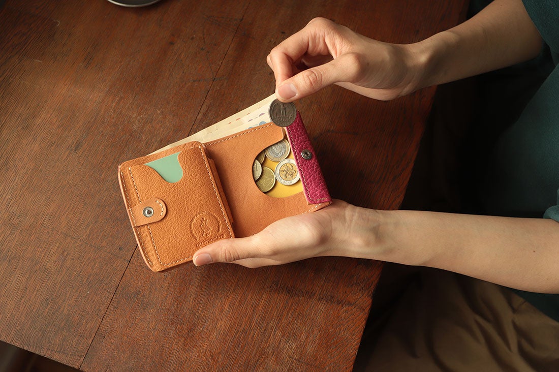 ミニ財布「小さいふ」は、お札を折らずに収納できる、手のひらサイズのコンパクト財布。