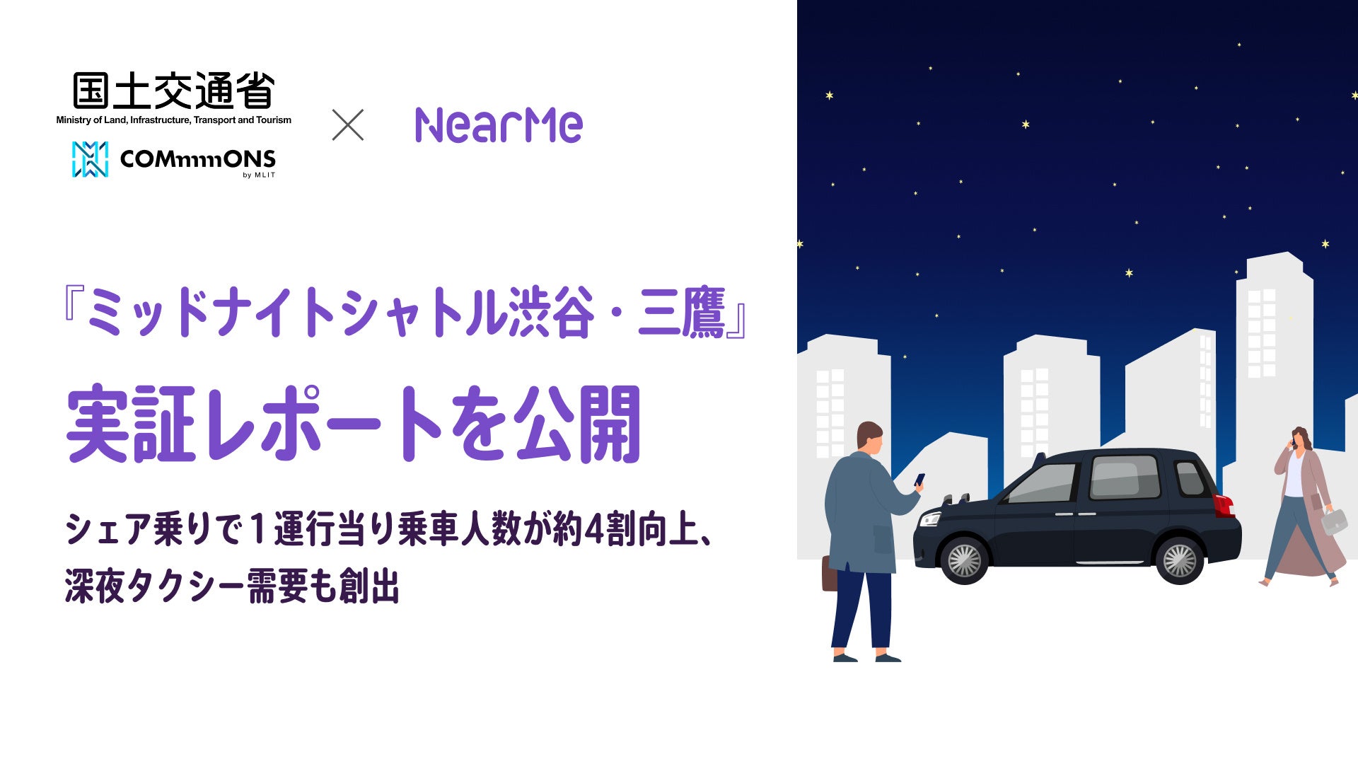 移動に関する社会課題の解決に取り組むソーシャルデザインカンパニー、株式会社NearMe(本社:東京都中央区、代表取締役社長:髙原幸一郎、以下「ニアミー」)は、国土交通省が事業実施主体である地域交通DX推進プロジェクト「COMmmmONS」(コモンズ)において受託開発を行った“リアルタイム相乗りマッチングシステム”を活用した『ミッドナイトシャトル渋谷』『ミッドナイトシャトル三鷹』の運行を実施いたしました。本運行では、深夜帯におけるタクシー需給ミスマッチの解消や移動利便性の向上に向け、リアルタイム相乗りマッチングの有効性について検証を行いました。その実証結果を取りまとめたレポートを公開しましたのでお知らせいたします。なお、レポートの詳細は「COMmmmONS」のウェブサイト上(https://www.mlit.go.jp/commmmons/tech_report/?page=2)でご覧いただくことができます。