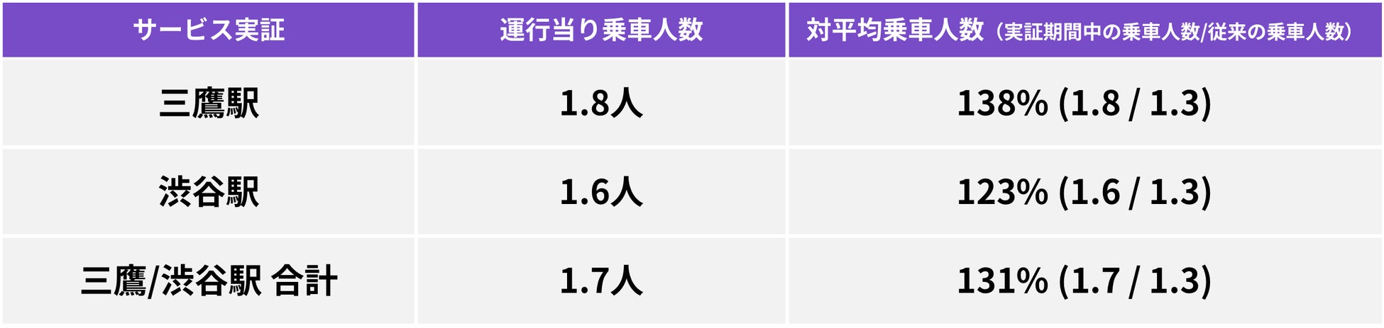 実証期間中の運行データより、タクシーの1運行当たりの乗車人数は1.7人(三鷹は1.8人、渋谷は1.6人)となりました。これは、三鷹・渋谷エリアのタクシーの平均乗車人数1.3人※と比較すると、三鷹での運行においては約4割向上しました。この結果から、目的地の近い利用者同士が同乗する“シェア乗り”の需要があり、リアルタイム相乗りマッチングが、深夜帯の移動需要の受け皿として機能することが示されました。