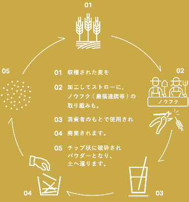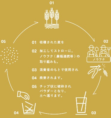 今回のタッチハッピーでは、環境負荷の低いアイテムとして期待されている「麦わらカトラリー(ストロー・スプーン・フォーク類)」の開発・生産を支援します。
