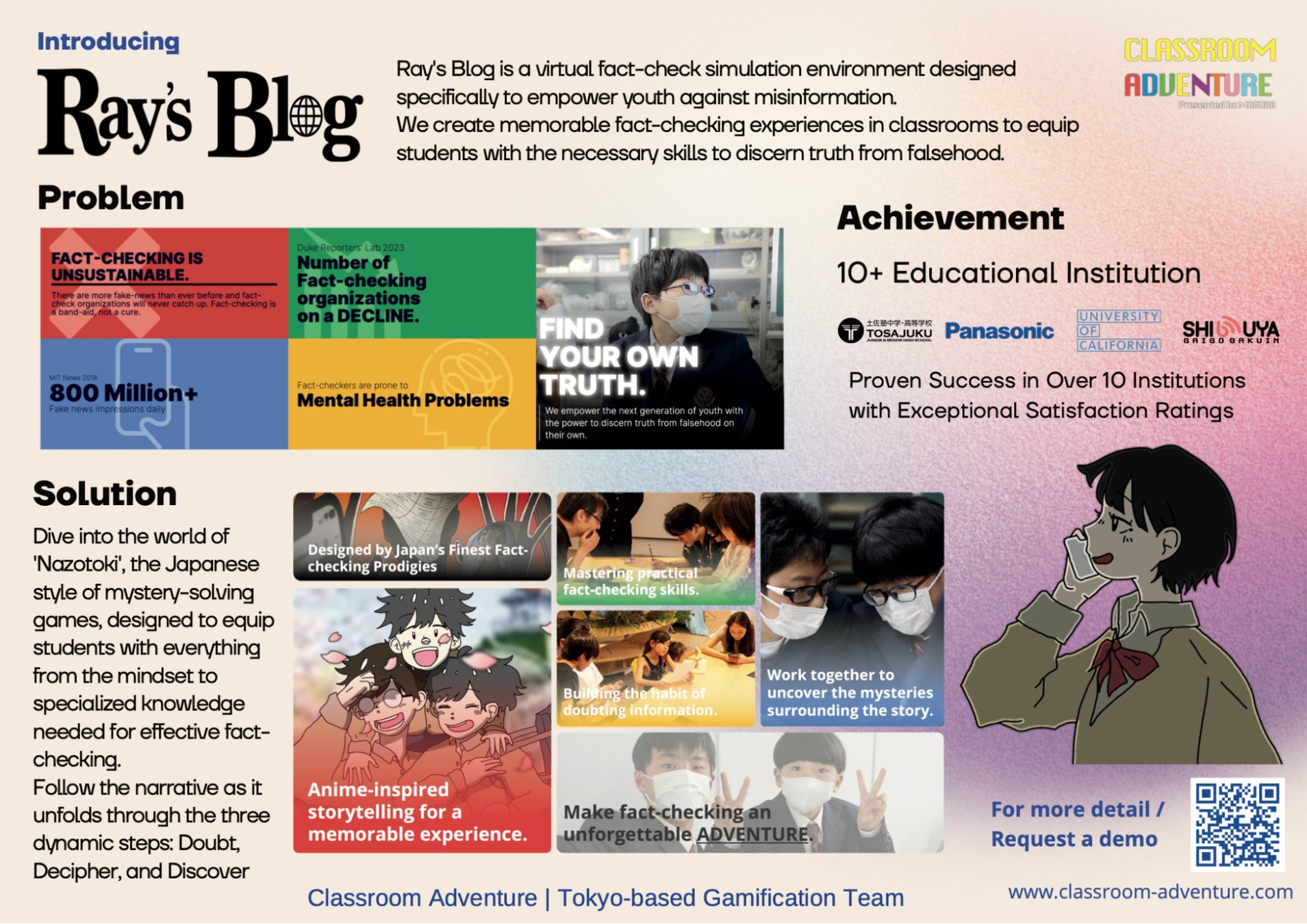 「Ray’s Blog」は謎解きゲーム方式でファクトチェックのスキルとマインドを学べる全く新しいプログラムです。日本の文化の象徴でもあるアニメの世界観で進んでいくストーリーは「レイ」と名乗る謎の人物からの挑戦状を受け取るところから始まります。プレイヤーたちは現実世界と同じく真偽がまざった情報たちの中から正しい情報を見つけて判断し、物語を進めていきます。大きな特徴として、「Ray’s Blog」では参加者は物語の世界を飛び出し、インターネットを使いながら、ファクトチェックを行います。参加者はゲームをプレイする中で情報を疑う力や、それぞれのメディアの特性(ショート動画や文字ベースSNS)など基本的なマインドセットを自然と身に着け、またGeopoint Location(画像分析)を始めとした専門的実践的なスキルにふれることができます。2023年の2月に日本語版をローンチし、これまでに様々な教育機関(中学校・高校/言語学校など)や単独イベントなどを開催してきました。
