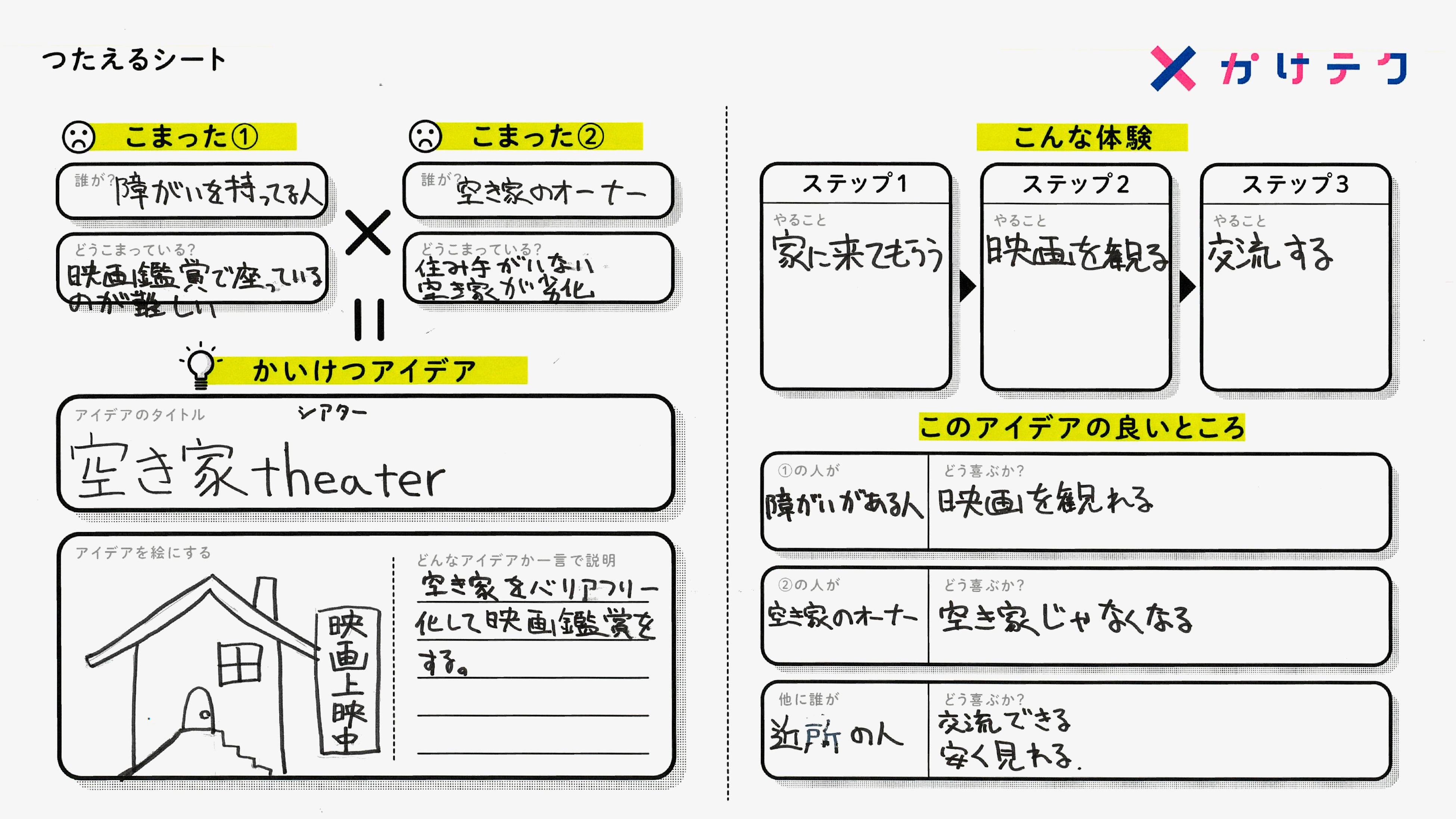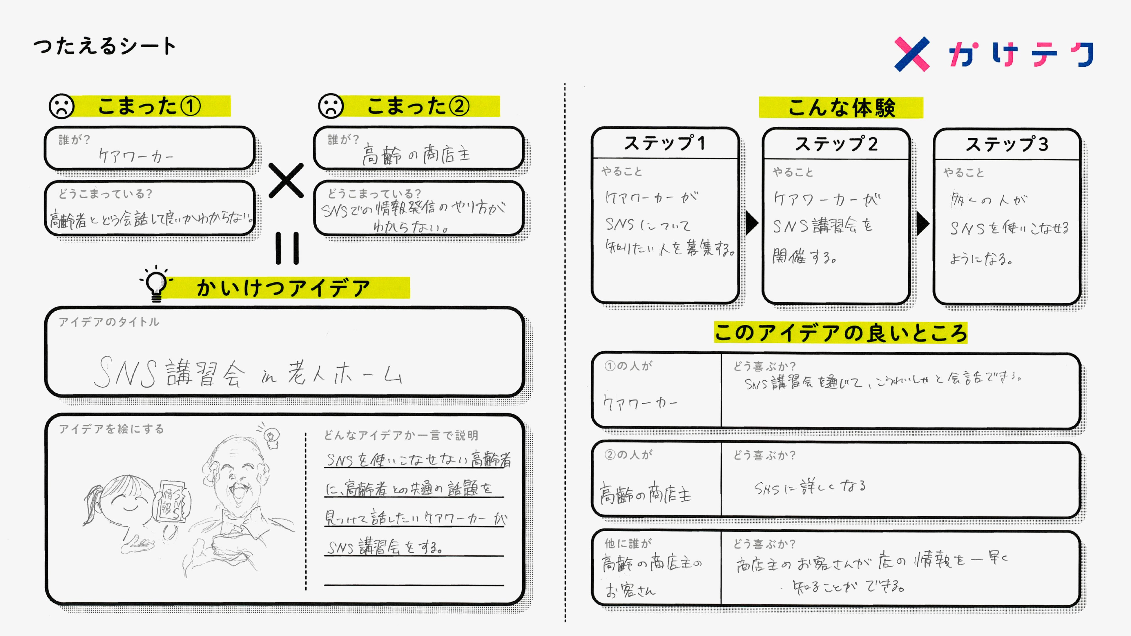 「かけテク」は、社会にある2つの困りごとをかけ合わせて、新しい解決策を生み出すという、広告会社ならではの発想法をベースにした探究型学習プログラムです。