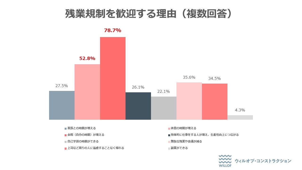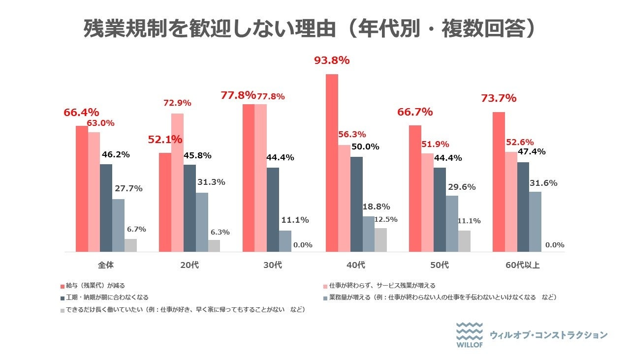 最後に、【残業規制を歓迎する理由・歓迎しない理由(複数回答)】について聞いたところ、残業規制を歓迎する理由は、「余暇(自分の時間)が増える」(78.7%)がトップ、次いで「休息の時間が増える」(52.8%)となりました。一方で、残業規制を歓迎しない理由は、「給与(残業代)が減る」(31.6%)がトップで、次いで「仕事が終わらず、サービス残業が増える」(30.0%)、「工期・納期が間に合わなくなる」(22.0%)という結果となり、残業代が減ることによる給与の目減りが一番の懸念事項であることがわかりました。サービス残業が増えることへの懸念については、20~30代の若手に特に多い結果になりました。残業規制が適用されても業務量が削減されるわけではないため、サービス残業の発生や納期遅れの不安を感じている方も多いようです。
