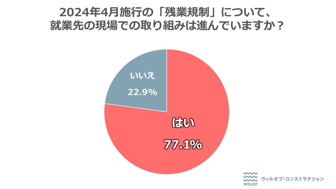2024年4月施行の「残業規制」について、就業先の現場での取り組みは進んでいるか】について聞いたところ、「はい」と回答した割合が77.1%でした。多くの現場が取り組みを進めている一方で、22.9%の現場においては、取り組みが進んでいる実感があまりない、と感じていることがわかりました。