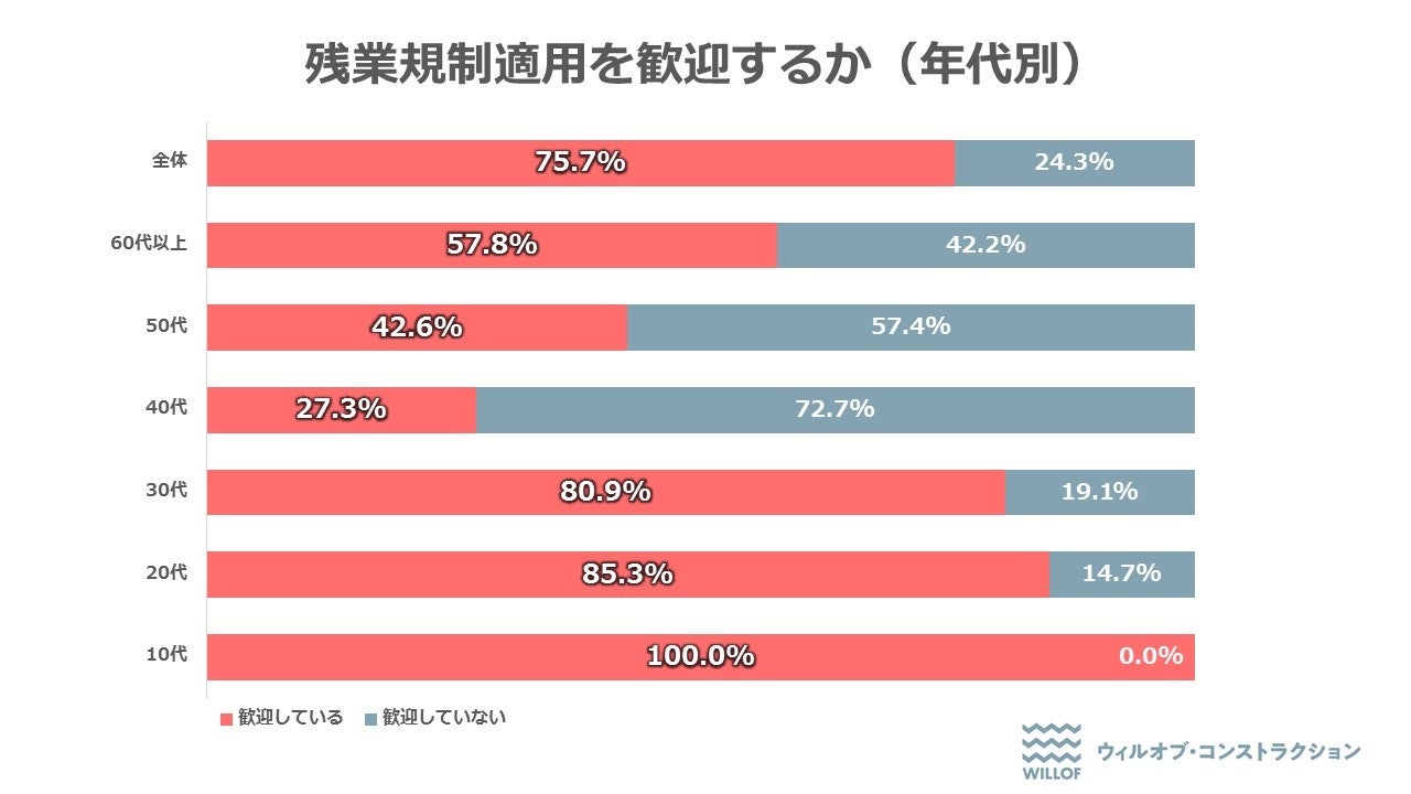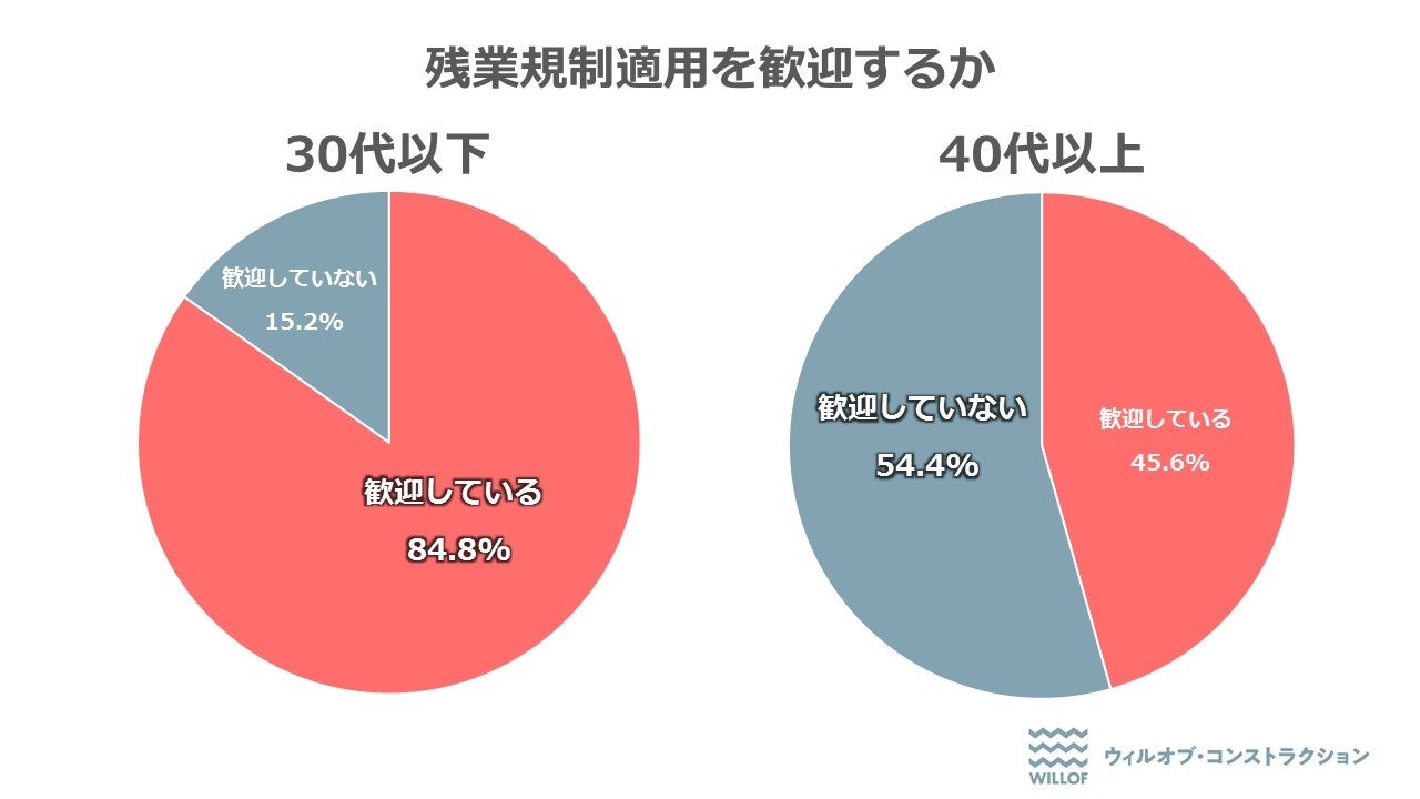 【「残業規制」に関する建設現場で働く社員の本音調査】残業規制を歓迎する若手が多い一方、40代以上の54.4%が残業規制を「歓迎しない」と回答