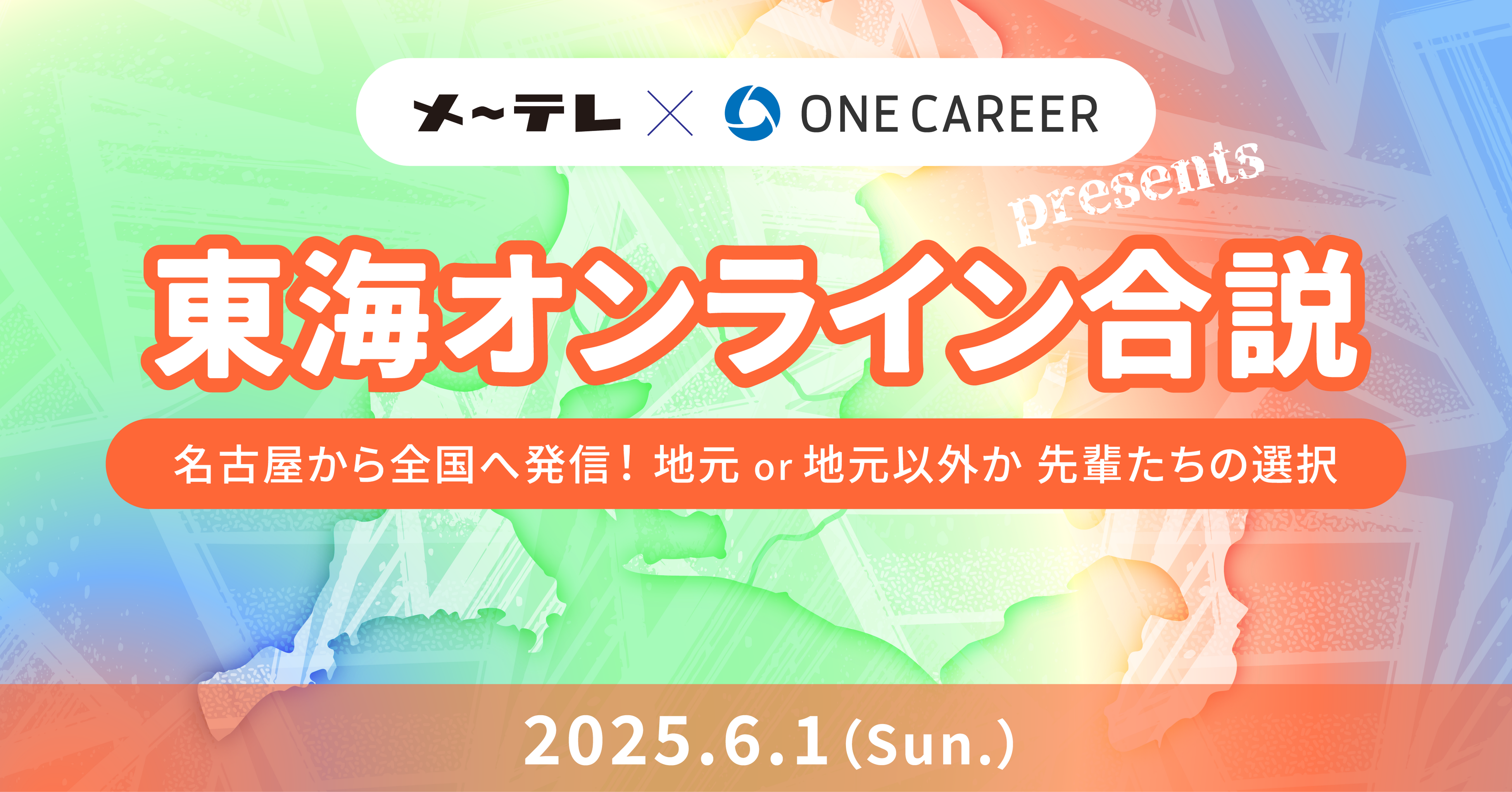 “はじめてのキャリアを選ぶ、就活サイト”「ONE CAREER」を運営する株式会社ワンキャリア(本社:東京都渋谷区、代表取締役社長 執行役員CEO:宮下 尚之、以下「ワンキャリア」)は、名古屋テレビ放送株式会社(本社:愛知県名古屋市、代表取締役社長:狩野 隆也、以下「メ〜テレ」)と共同で、東海エリアにゆかりのある学生を対象にした特別オンラインイベント「東海オンライン合説」を、6月1日(日)にワンキャリアのYouTubeチャンネルで配信します。