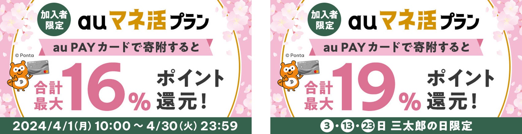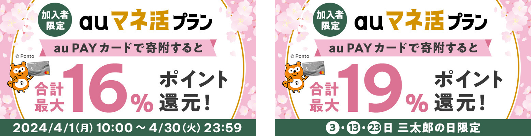 auマネ活プランに加入中のお客さまを対象に、キャンペーン期間中にエントリーの上、支払い方法で「au PAY カード」を選択し、au PAY ふるさと納税で10,000円以上寄附すると、au PAY カードでの寄附額に対して最大3%のPontaポイントを還元します。