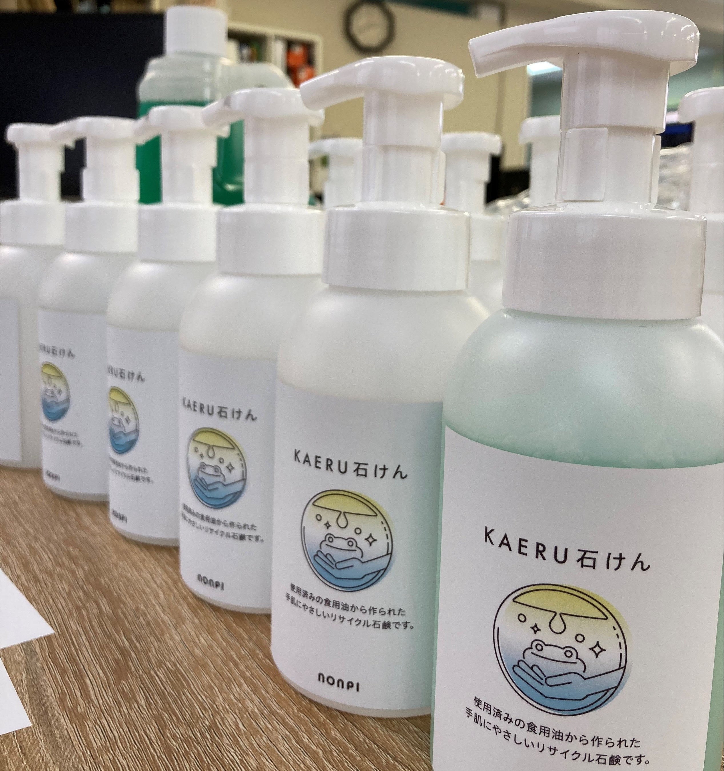 回収した廃食油はエスケー石鹸株式会社に送り、独自のリサイクルシステムにより「KAERU石鹸」に生まれ変わります。
