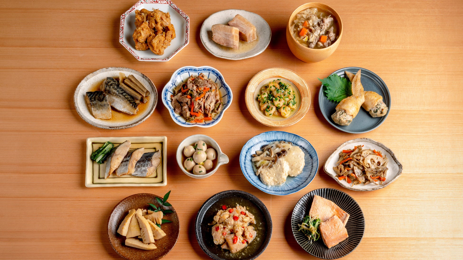 筍の醬油煮(約80g)/鮭の生姜蒸し(約140g)/きんぴら(約80g)/豆腐ハンバーグ(約150g)/豚汁(約200g)/手羽先餃子(2本)/油淋鶏(約140g)/豚の角煮(約130g)/海老の甘辛ネギまみれ(約80g)/さばの煮付け(約150g)/鶏肉のねぎ塩炒め(約140g)/さわらの幽庵焼き(約120g)/豚の生姜焼き(約160g)/ウズラの味付け卵(約80g)
