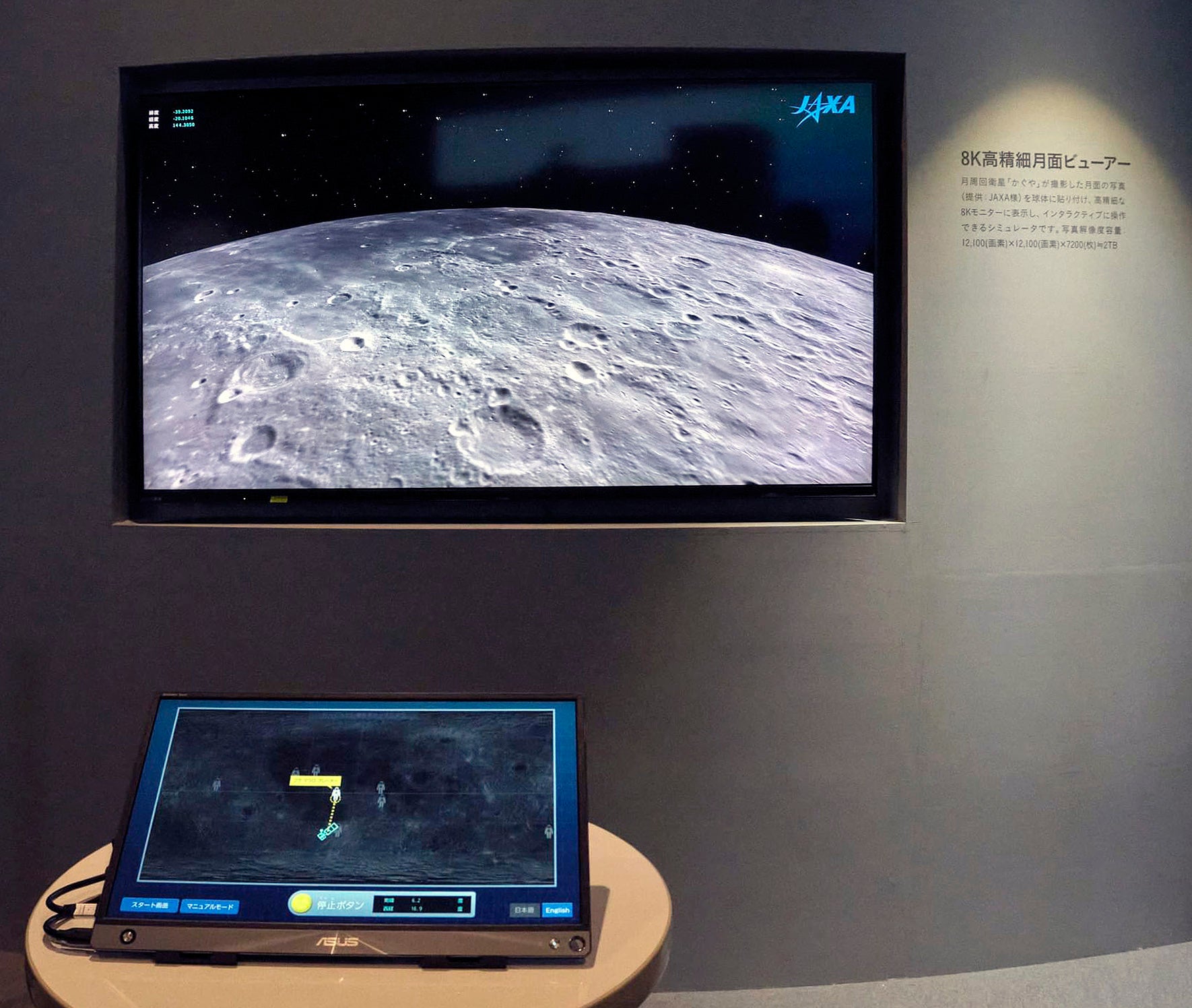 「8K高精細月面ビューアー」は、JAXA の月周回衛星「SELENE」(かぐや)が取得した月面全球の画像および標高データを使用し、月面の地形の様子を3Dで再現しています。クレータやアポロ11号着陸地点など、細かな凹凸までわかるよう高精細8Kモニターに表示しながら、インタラクティブに操作できるシミュレータです。