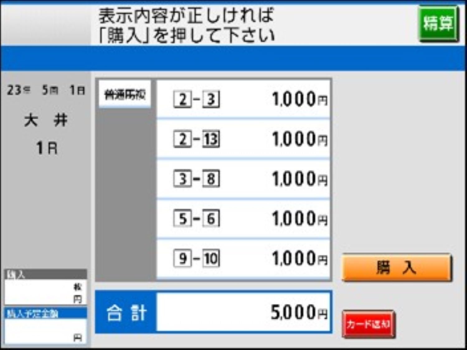 ③挿入した投票カード(マークカード)の内容を 1 枚ごとに確認し表示内容が正し ければ「購入」ボタンを押してください。 ※一度確認画面で「購入」を選択すると、手順④⑤で PayPay の残高不足等によ り取引をキャンセルした場合、挿入した投票カード(マークカード)は返却されませ ん。あらかじめ購入金額とPayPay残高をお確かめのうえ、投票カード(マークカー ド)を挿入ください。