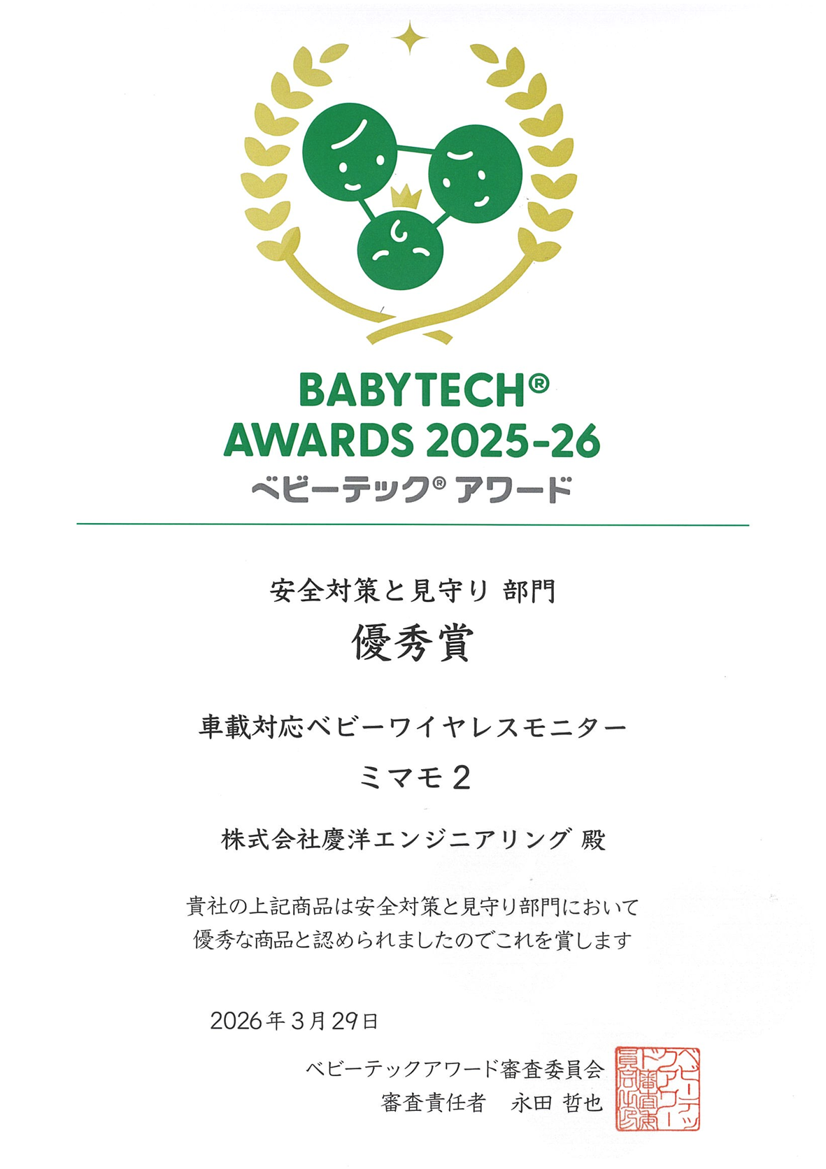 株式会社 慶洋エンジニアリング(本社:東京都港区)は、「KEIYO」ブランドの運転時も振り向かずに子供を見守れる車載対応ベビーモニター「ミマモ2」が「BabyTech(R) Awards 2025-26 安全対策と見守り部門 優秀賞」を受賞した事をお知らせします。