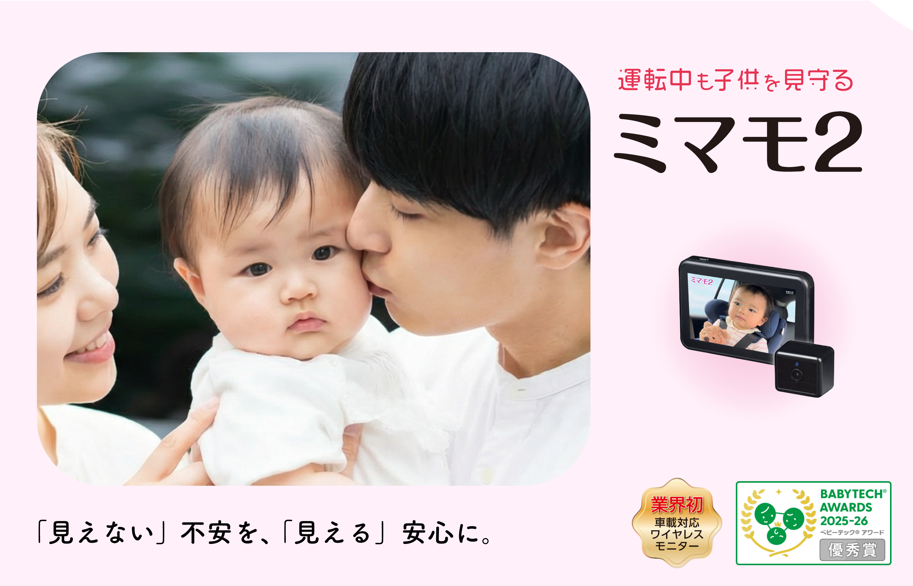 2024年12月に発表した車載対応べビーモニター「ミマモ」は、子育て真っ盛りのママ・パパの運転をカー用品の視点から車内安心安全アイテム 快適アイテムを企画販売しサポートしていきたい、という想いで立ち上げられました。「ミマモ」は車載環境に対応した子供用のベビーワイヤレスモニターです。
