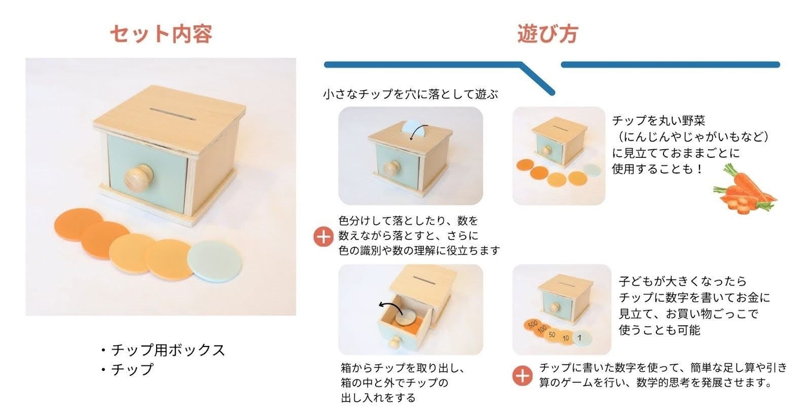 穴にチップを入れる際の手首を捻る動きが、自分でごはんを食べる動きにも繋がるため、楽しく体を器用に動かすことを学べるように選定しました。