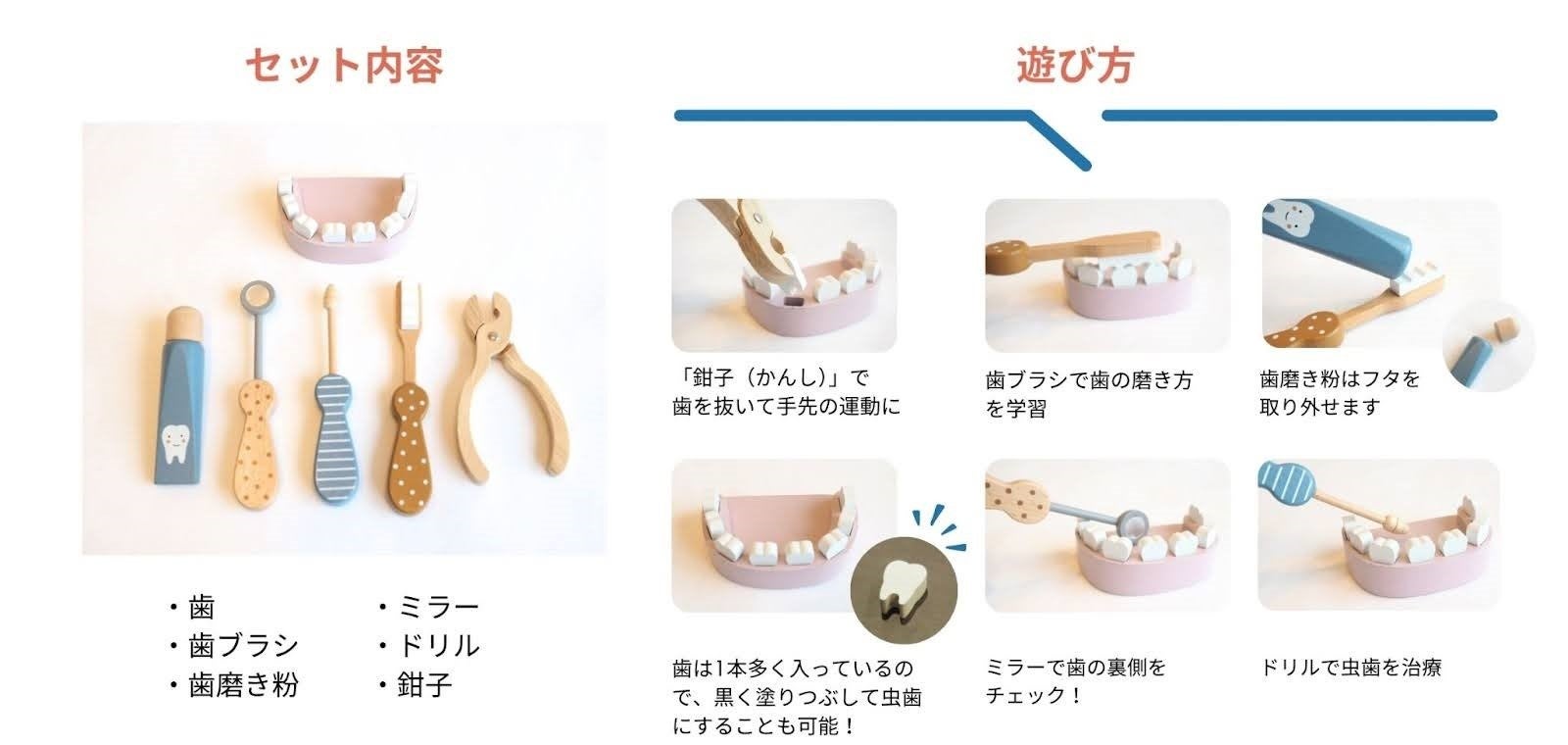 内容 :歯や歯ブラシなど6種類の木製のおもちゃがセット