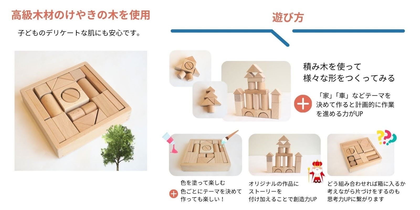 積み木を箱に収めたり積み上げることは、空間認識力を養うことができます。瞬時にモノや形を把握するスキルは、将来の論理的思考力のための土台作りにもなるため選定しました。