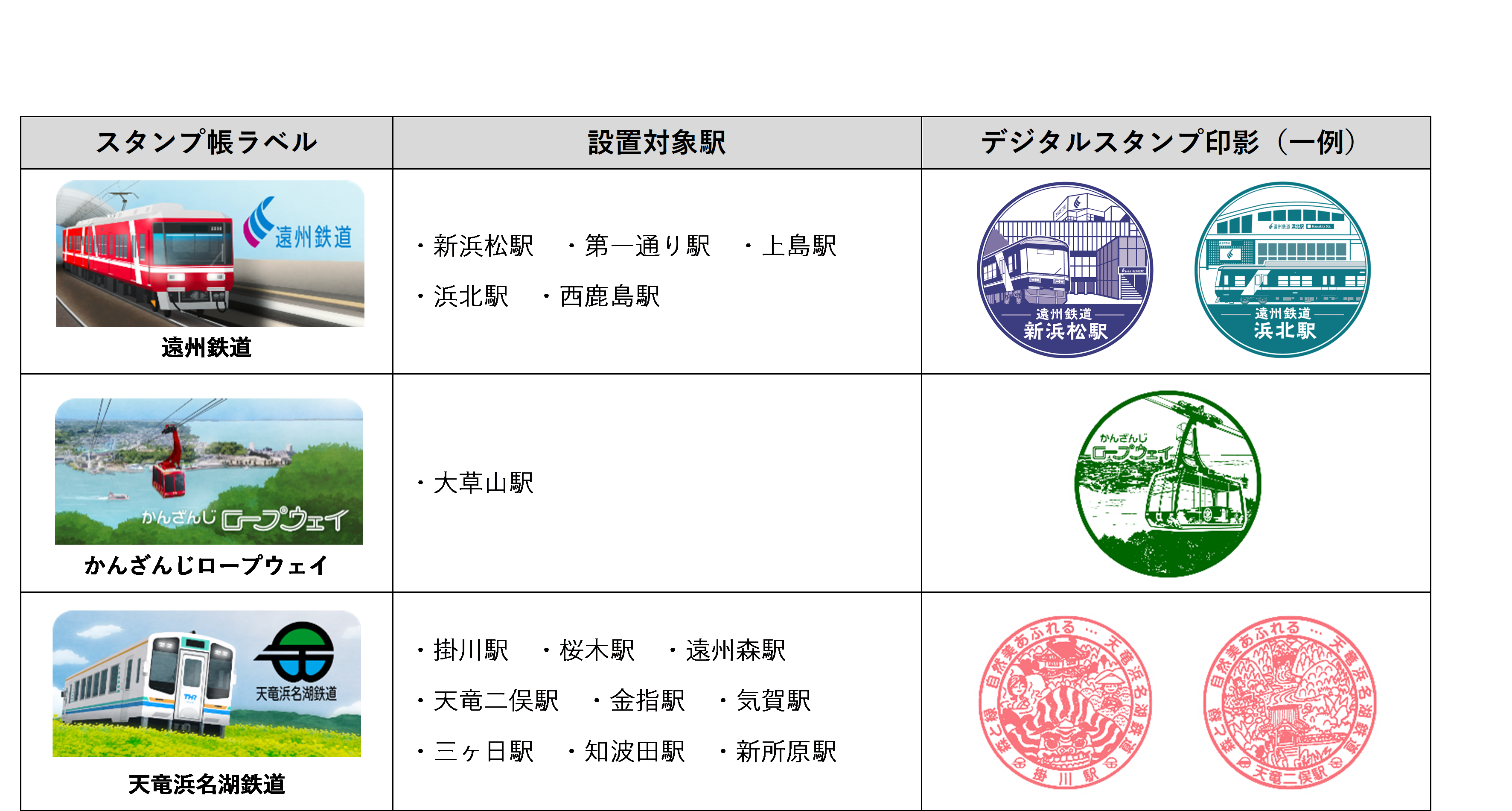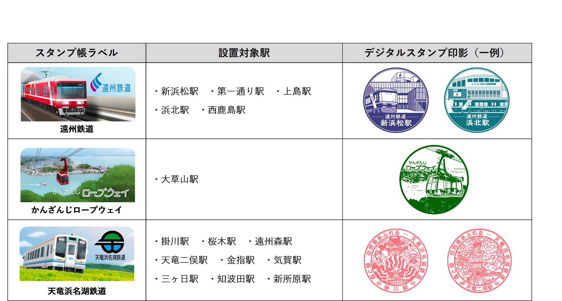 遠州鉄道の5駅、かんざんじロープウェイの1駅、天竜浜名湖鉄道の9駅で、デジタル駅スタンプをご利用いただけます。