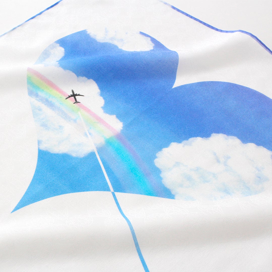 「旅立つ前のワクワク感」「帰途で味わう充実感」をハート型の青空と虹、一直線に飛ぶ飛行機で表現しました。