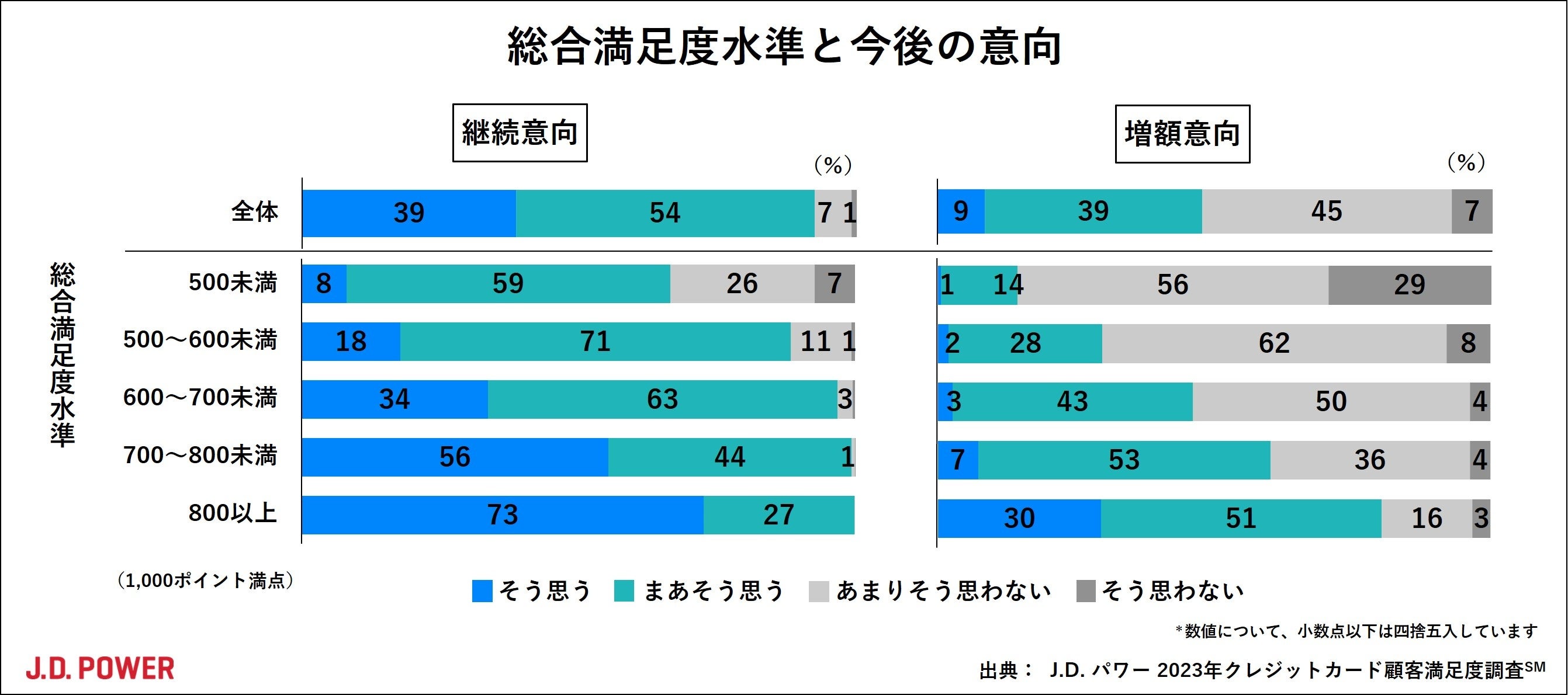 本調査では継続意向(今後も続けて利用したい)や増額意向(利用金額を増やしていきたい)についても聴取しているが、総合満足度が高いほど、これらの意向が高い傾向にあることが確認されている。継続意向と増額意向を比較すると、継続意向では、総合満足度が「700~800ポイント未満」で「そう思う」が半数以上となる。一方、増額意向では、総合満足度が「700~800ポイント未満」では、その割合は7%と大きく下回り、「800ポイント以上」でも3割にとどまる。増額意向を高めるためには、さらに高い顧客満足度を実現することが重要と言える。