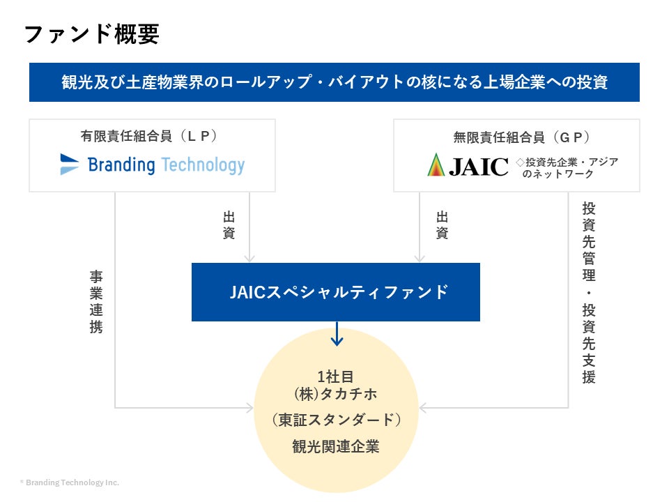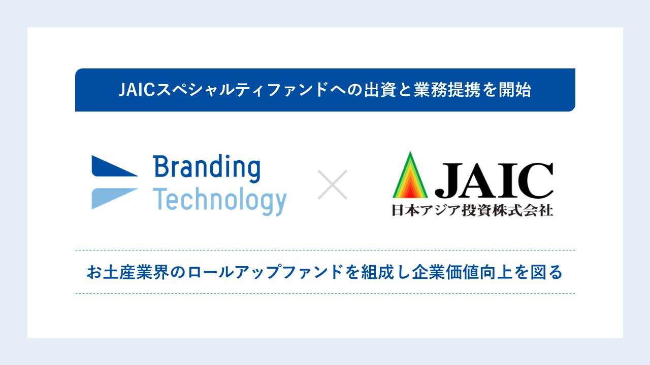 ブランディングテクノロジー株式会社(代表取締役社長:木村 裕紀、本社:東京都渋谷区、証券コード7067、以下当社)は、日本アジア投資株式会社(代表取締役 社長執行役員 CEO兼CIO:丸山 俊、本社:東京都千代田区、証券コード8518、以下日本アジア投資)が運営するJAICスペシャルティファンドへの出資と業務提携を開始しました。