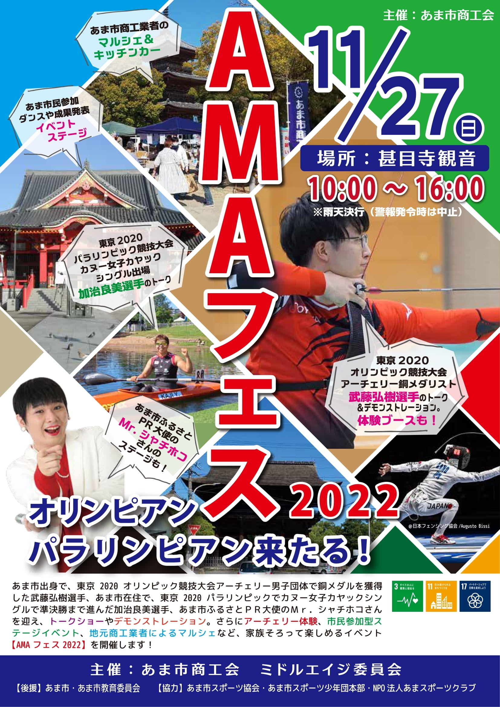 あま市商工会(愛知県)は11月27日(日)、鳳凰山甚目寺にてAMAフェス2022を開催します。イベントでは、あま市出身で東京2020オリンピック競技大会アーチェリー男子団体銅メダルを獲得した武藤弘樹選手、あま市在住で東京2020パラリンピック競技大会カヌー女子カヤックシングル準決勝まで進んだ加治良美選手、あま市ふるさとPR大使のMr.シャチホコさんを迎え、トークショーやデモンストレーションを行います。また、アーチェリー体験、市民参加型ステージイベント、地元商工業者によるマルシェを開催いたします。