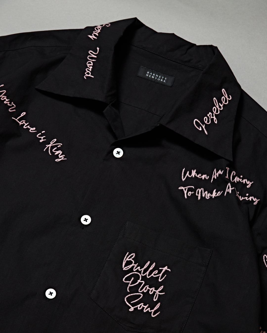 もう一型のアロハシャツは薄手のコットンポプリン素材。楽曲名を一針ずつ丁寧に総刺繍でほどこした特別な逸品。生地に間隔を開けながら刺繍を進めるという、時間と労力を惜しまない製法により、着る者の感性を刺激するクラフツマンシップが体現されています。仕上げには「ピン黒」と呼ばれるヴィンテージでも高い価値を誇る配色を用い、視覚的にも印象深いアロハシャツに仕上げました。