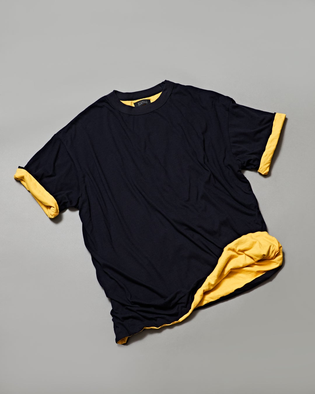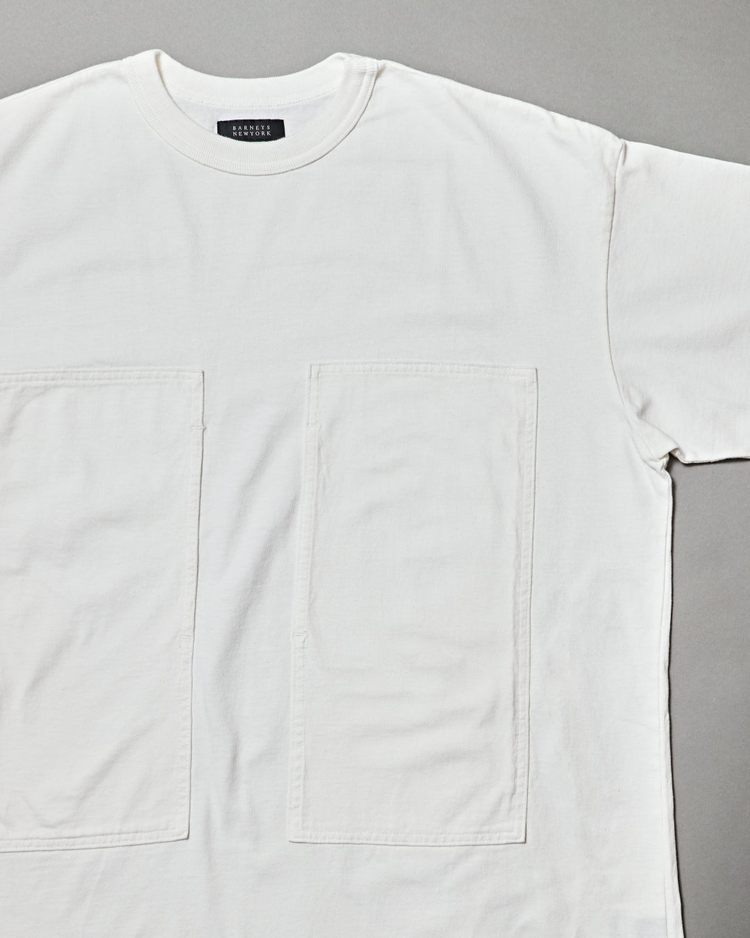 ヴィンテージマニアの間で高く評価されている某ダブルフェイスTシャツを今野氏の視点で再解釈したもの。市場に流通する小さなサイズ感の課題を解消すべく、リアルに着やすいバランスに再設計。細番手のコットンを使用することで、肌ざわりのよさにもこだわりました。重ね着風のディテールがありながら、着心地は軽く、夏でも快適に楽しめます。