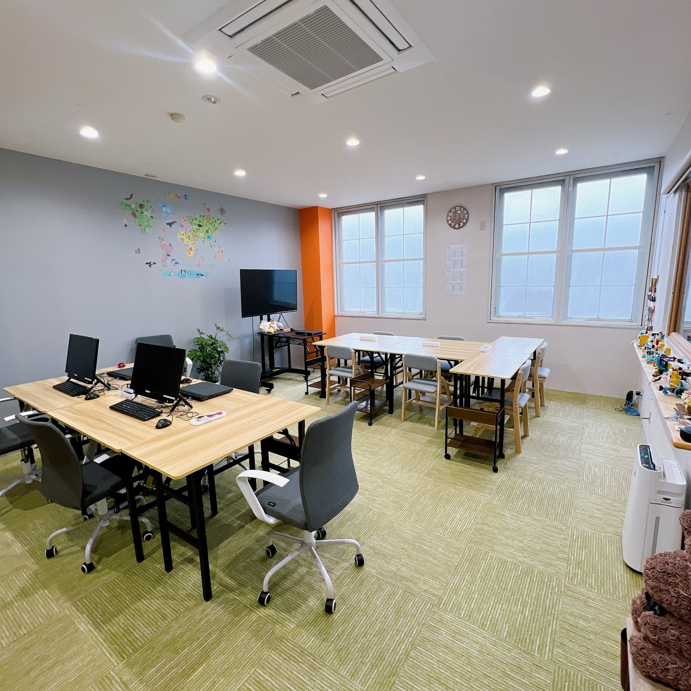 2階 レンタルスペースDは事前予約制。広々とした空間で、オフィスチェアとデスクをご用意しています。セミナーや勉強会の開催に最適です。
