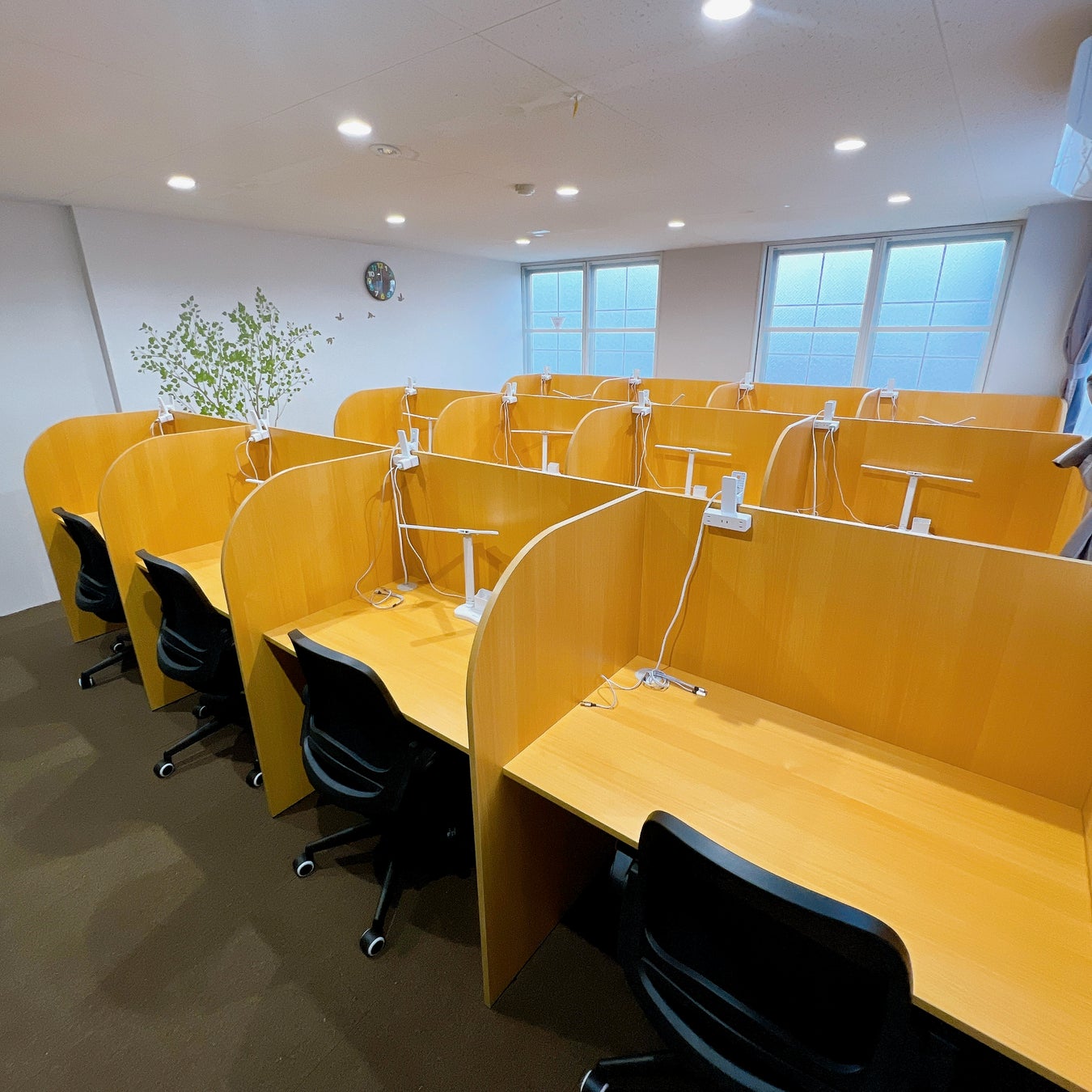 3階の自習室は全部で12席。大きな窓が2面にあり、机幅も広いため、広々した空間で集中して勉強できる環境をご用意しています。